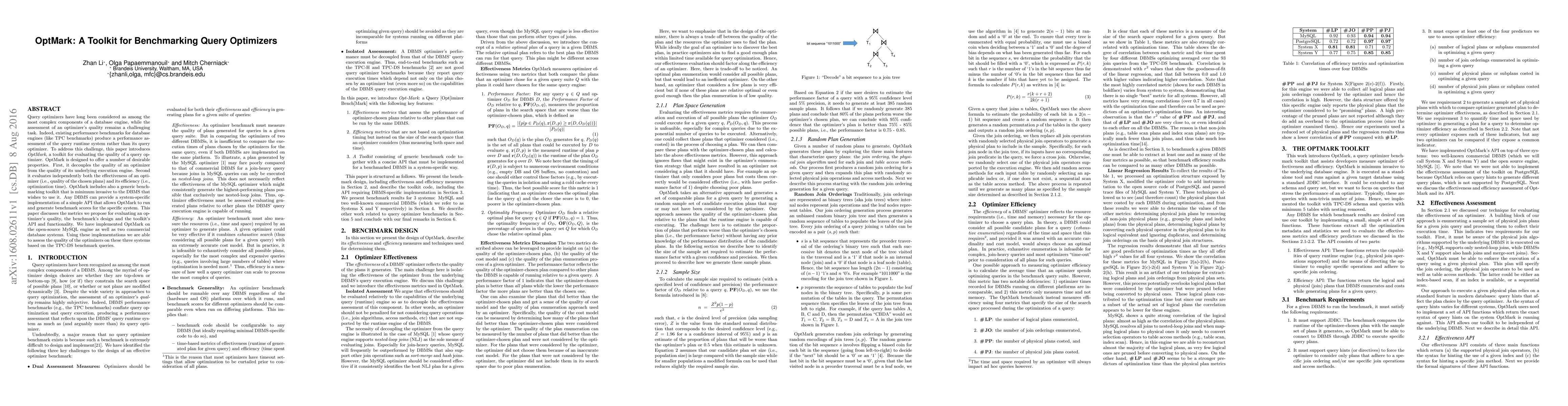 OptMark is a toolkit for evaluating query optimizer quality, providing metrics on effectiveness and efficiency, and decoupling optimizer evaluation from execution engine performance.