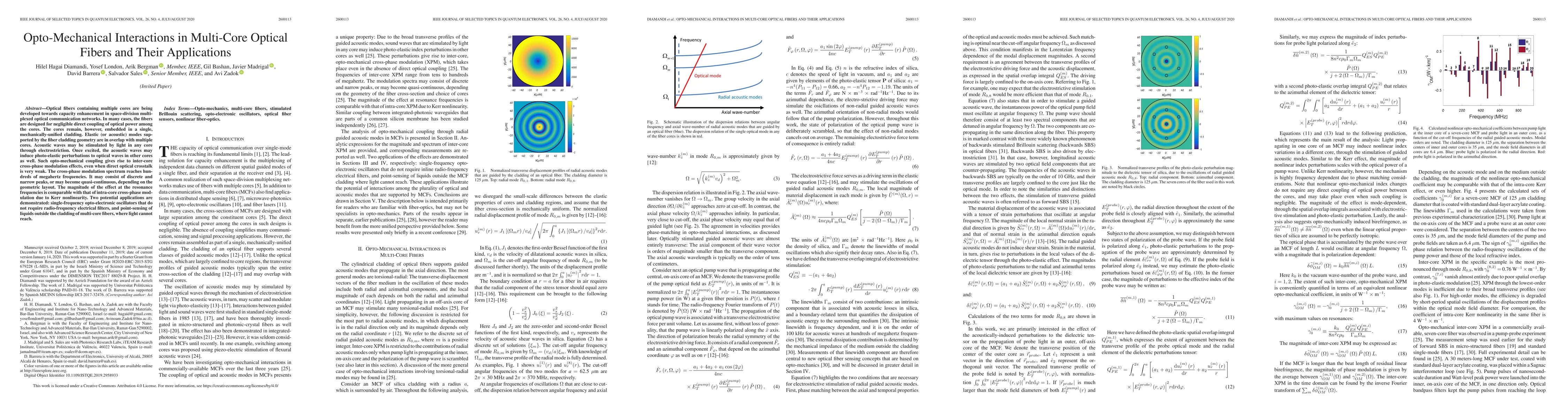 This paper investigates opto-mechanical interactions in multi-core optical fibers, revealing inter-core cross-phase modulation effects driven by acoustic waves stimulated by light. Potential applications include opto-electronic oscillators and liquid sensing outside the cladding.