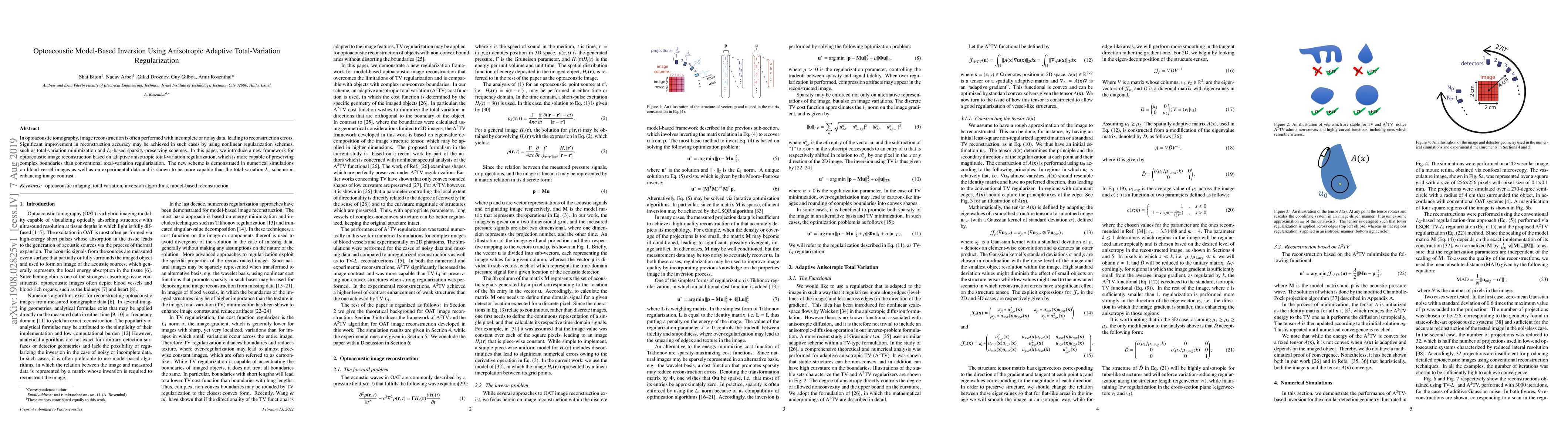 In optoacoustic tomography, image reconstruction is often performed with incomplete or noisy data, leading to reconstruction errors. Significant improvement in reconstruction accuracy may be achieved in such cases by using nonlinear regularization schemes, such as total-variation minimization and $L_1$-based sparsity-preserving schemes. In this paper, we introduce a new framework for optoacoustic image reconstruction based on adaptive anisotropic total-variation regularization, which is more capable of preserving complex boundaries than conventional total-variation regularization. The new scheme is demonstrated in numerical simulations on blood-vessel images \textcolor{black} {as well as on experimental data} and is shown to be more capable than the total-variation-$L_1$ scheme in enhancing image contrast.