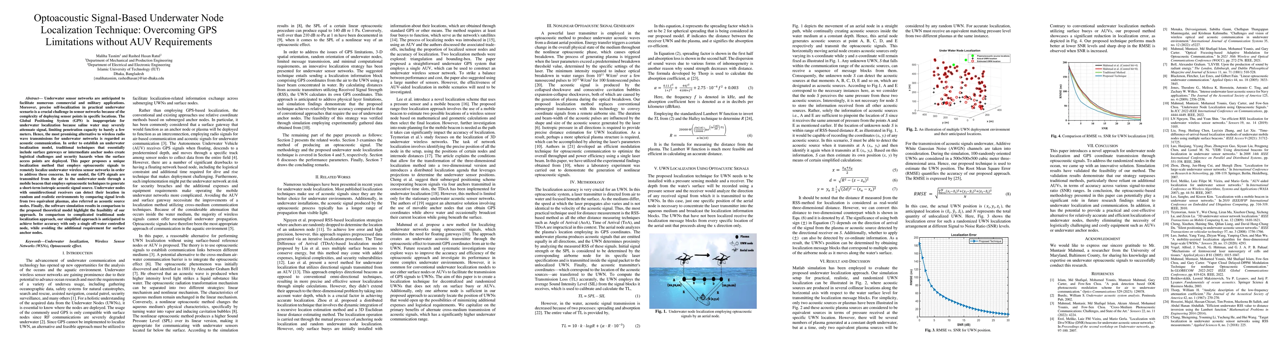 Underwater sensor networks are anticipated to facilitate numerous commercial and military applications. Moreover, precise self-localization in practical underwater scenario is a crucial challenge in sensor networks because of the complexity of deploying sensor points in specific locations. The Global Positioning System (GPS) is inappropriate for underwater localization because saline water may severely attenuate signal, limiting penetration capacity to barely a few meters. Hence, the most promising alternative to wireless radio wave transmissions for underwater networks is regarded as acoustic communication. In order to establish an underwater localization model, traditional techniques that essentially include surface gateways or intermediate anchor nodes create logistical challenges and security hazards when the surface access points are deployed. This paper proposes a unique localization method that employs optoacoustic signals to remotely localize underwater wireless sensor networks in order to address these concerns. In our model, the GPS signals are transmitted from the air to the underwater node through a mobile beacon that employs optoacoustic techniques to generate a short-term isotropic acoustic signal source. Underwater nodes with omnidirectional receivers can detect their location in random and realistic environments by comparing signal levels from two equivalent plasmas, also referred as acoustic source nodes. Finally, the software simulation results in comparison to the proposed theoretical model highlight the feasibility of our approach. In comparison to complicated traditional node localization approach, our simplified approach is anticipated to achieve better accuracy with only a single off-water controlled node, while avoiding the additional requirement for surface anchor nodes.