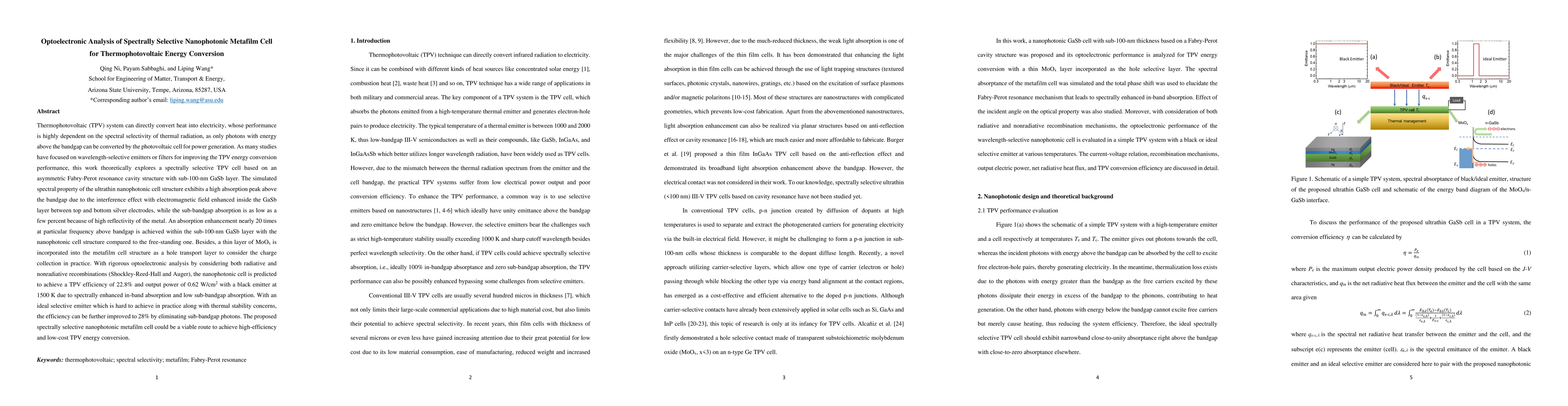 This work theoretically explores a spectrally selective TPV cell based on an asymmetric Fabry-Perot resonance cavity structure with sub-100-nm GaSb layer. The simulated spectral property of the ultrathin nanophotonic cell structure exhibits a high absorption peak above the bandgap due to the interference effect with electromagnetic field enhanced inside the GaSb layer between top and bottom silver electrodes, while the sub-bandgap absorption is as low as a few percent because of high reflectivity of the metal. An absorption enhancement nearly 20 times at particular frequency above bandgap is achieved within the sub-100-nm GaSb layer with the nanophotonic cell structure compared to the free-standing one. Besides, a thin layer of MoOx is incorporated into the metafilm cell structure as a hole transport layer to consider the charge collection in practice. With rigorous optoelectronic analysis by considering both radiative and nonradiative recombinations (Shockley-Reed-Hall and Auger), the nanophotonic cell is predicted to achieve a TPV efficiency of 22.8% and output power of 0.62 W/cm2 with a black emitter at 1500 K due to spectrally enhanced in-band absorption and low sub-bandgap absorption. With an ideal selective emitter which is hard to achieve in practice along with thermal stability concerns, the efficiency can be further improved to 28% by eliminating sub-bandgap photons. The proposed spectrally selective nanophotonic metafilm cell could be a viable route to achieve high-efficiency and low-cost TPV energy conversion.
