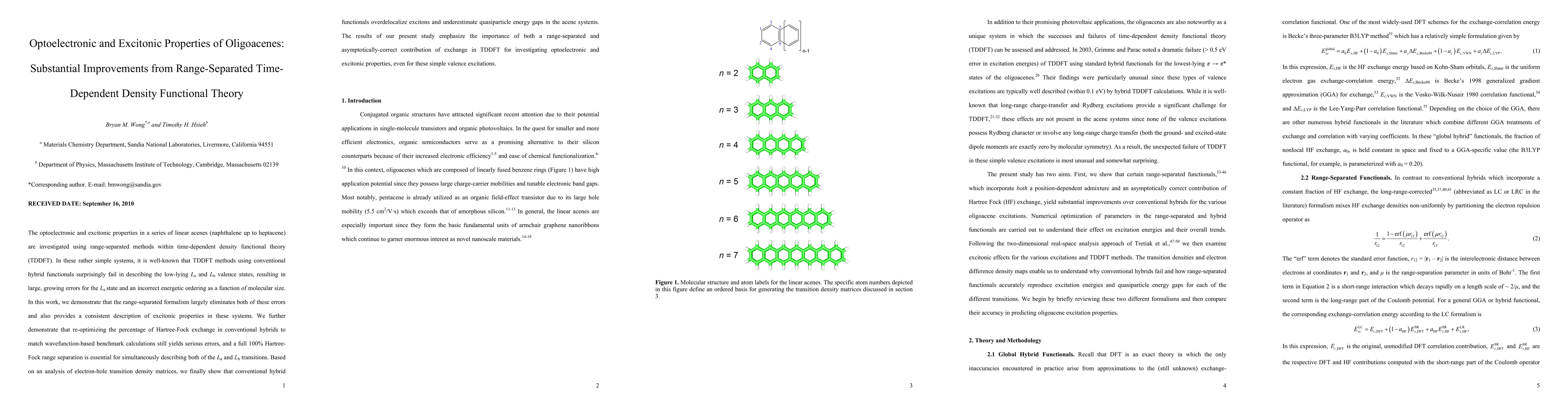 This paper investigates the optoelectronic and excitonic properties of linear acenes using range-separated time-dependent density functional theory (TDDFT). It finds that conventional hybrid functionals fail to accurately describe low-lying valence states, but range-separated methods correct these errors, emphasizing the need for an asymptotically-correct exchange contribution in TDDFT.