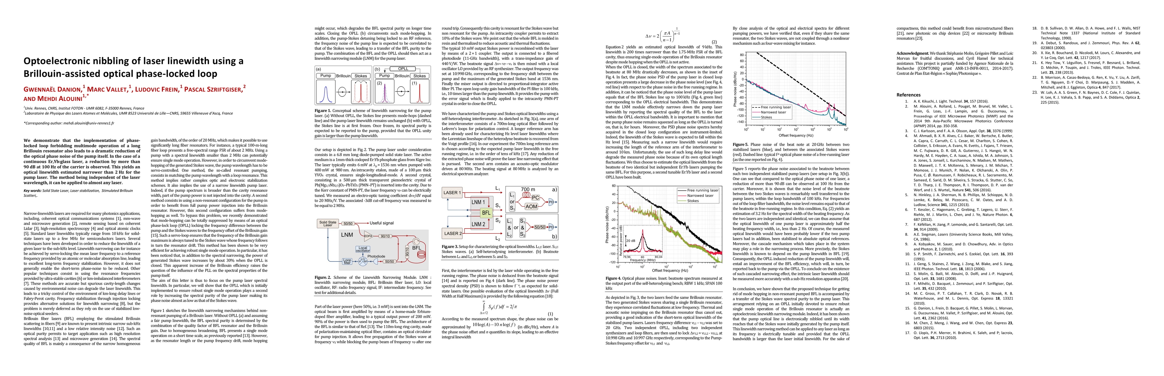 This paper demonstrates a method of significantly reducing optical phase noise in lasers using a Brillouin-assisted optical phase-locked loop, achieving a 90 dB reduction at 100 Hz for an Er,Yb:glass laser, resulting in an optical linewidth narrower than 2 Hz. The technique is wavelength-independent and applicable to various lasers.