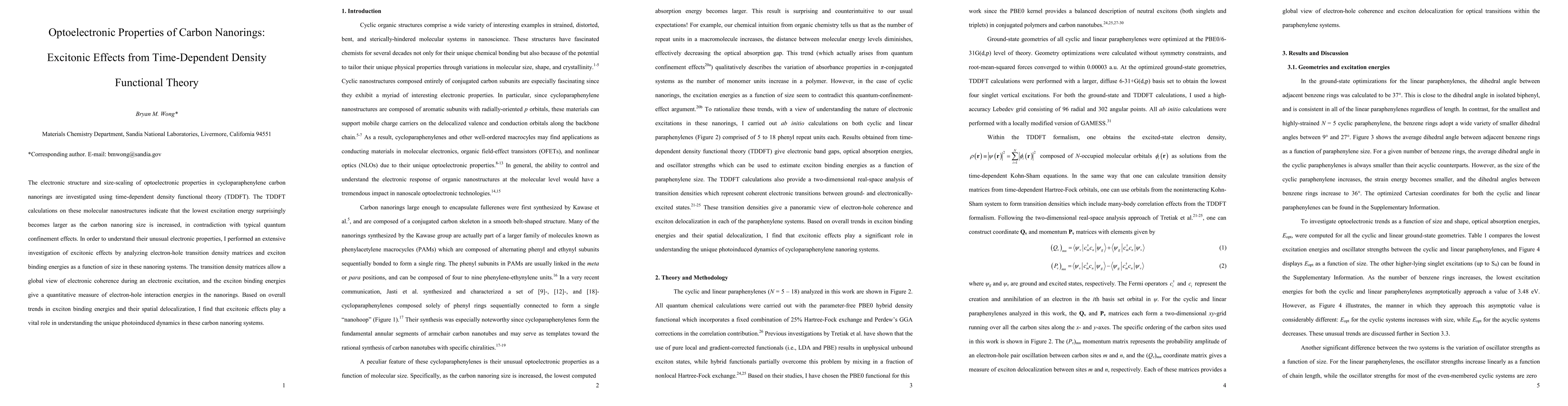 This paper investigates the optoelectronic properties of cycloparaphenylene carbon nanorings using time-dependent density functional theory (TDDFT), revealing that the lowest excitation energy increases with size contrary to typical quantum confinement effects. The study finds that excitonic effects, analyzed through transition density matrices and exciton binding energies, are crucial for understanding the unique photoinduced dynamics in these nanorings.