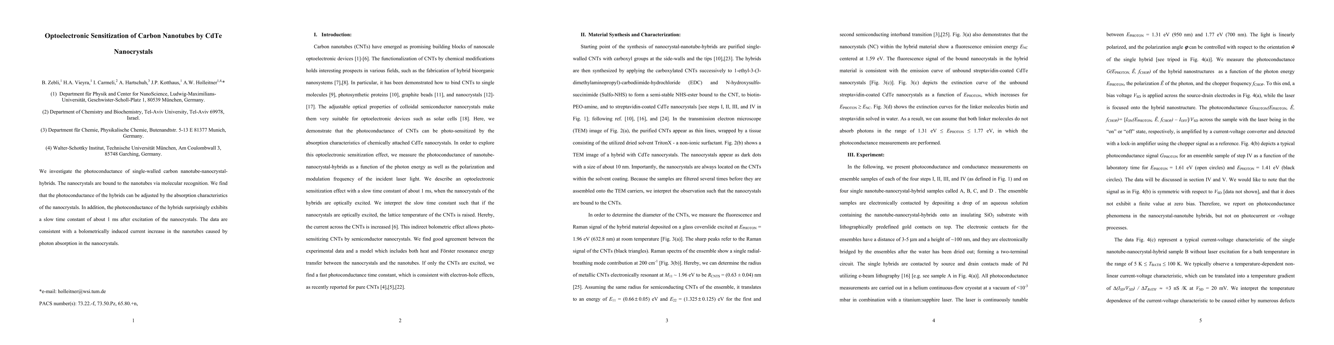 This paper explores the photoconductance of single-walled carbon nanotubes hybridized with CdTe nanocrystals, revealing that the nanocrystals' absorption characteristics can modulate the hybrids' photoconductance. The hybrids exhibit a slow photoconductance time constant of about 1 ms, suggesting a bolometrically induced current increase in the nanotubes.