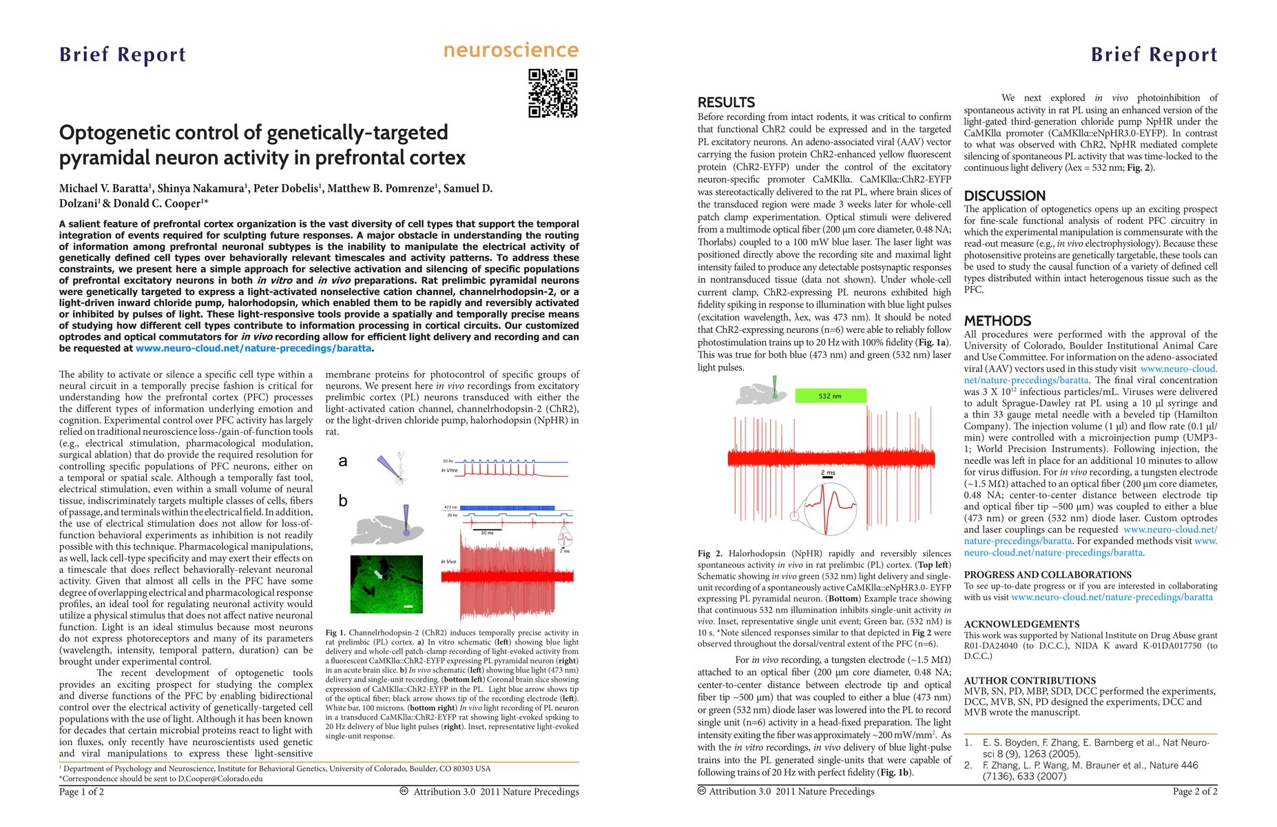 This paper presents a method for optogenetically controlling genetically targeted pyramidal neurons in the rat prefrontal cortex using channelrhodopsin-2 for activation and halorhodopsin for inhibition, enabling precise study of cell-type specific contributions to cortical information processing. The authors also developed customized optrodes and optical commutators for in vivo experiments.
