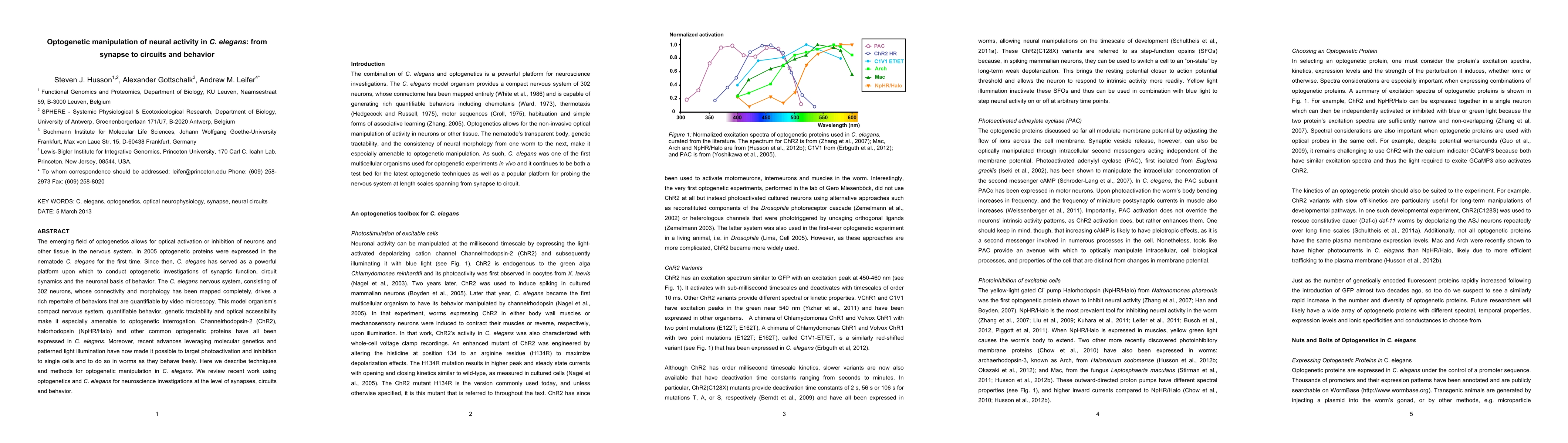 This paper explores the use of optogenetics in C. elegans to manipulate neural activity, focusing on synaptic function, circuit dynamics, and behavior. It highlights the advantages of C. elegans as a model organism for these studies and reviews recent advancements in targeting specific neurons with light.