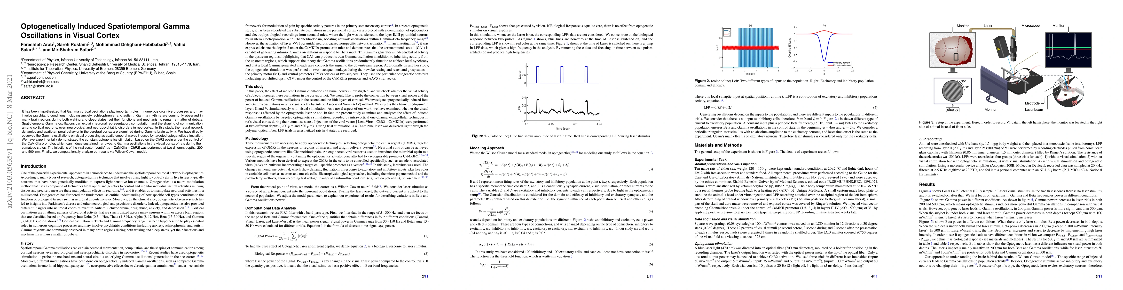 This study investigates the role of Gamma oscillations in visual cortex using optogenetics to induce spatiotemporal waves. The research demonstrates sustained narrowband Gamma oscillations in rat visual cortex via targeted ChR2 opsin stimulation, revealing potential implications for cognitive processes and neuropsychiatric disorders.