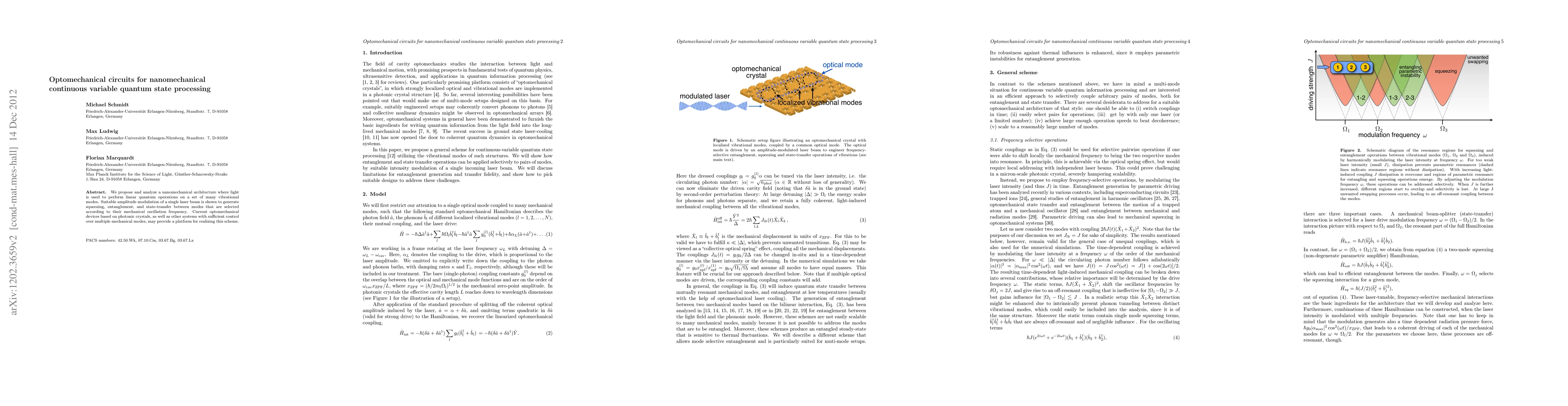 This paper proposes a nanomechanical architecture using optomechanical circuits to perform linear quantum operations on multiple vibrational modes via light modulation, enabling squeezing, entanglement, and state-transfer based on mechanical frequency. It suggests that photonic crystal-based optomechanical devices could realize this scheme.