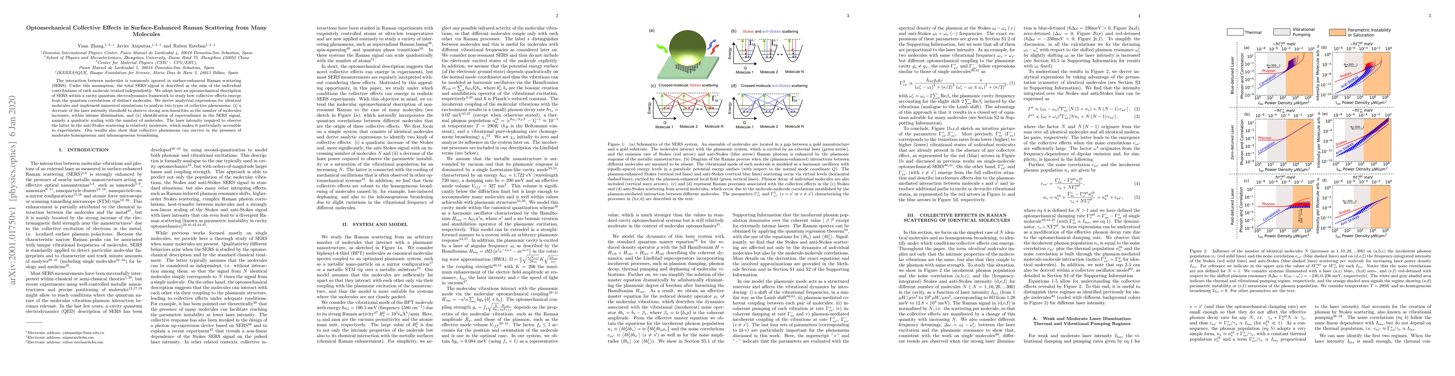 This paper studies collective optomechanical effects in surface-enhanced Raman scattering (SERS) using a cavity quantum electrodynamics framework, revealing a decrease in the laser intensity threshold for strong non-linearities and identifying superradiance with quadratic scaling as the number of molecules increases. These phenomena are accessible experimentally even with moderate broadening.