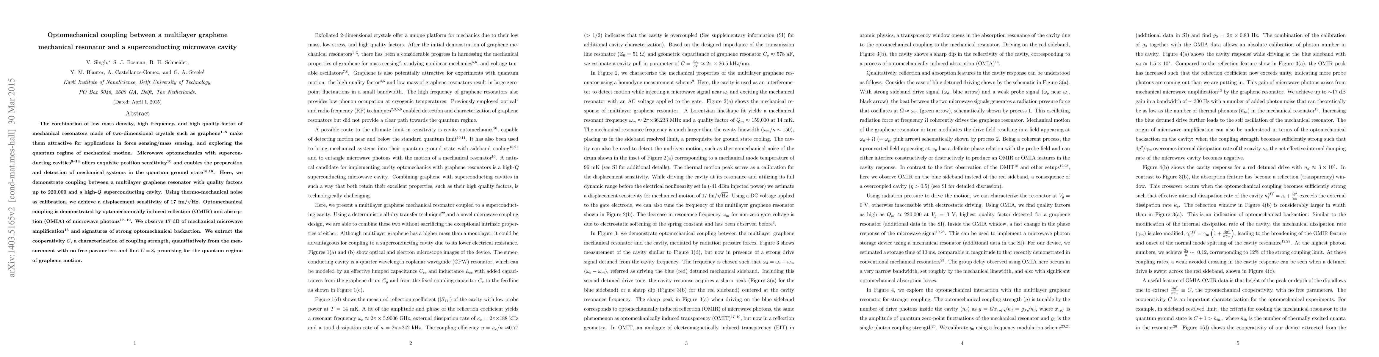 This research demonstrates the optomechanical coupling between a multilayer graphene mechanical resonator and a superconducting microwave cavity, achieving high sensitivity and mechanical microwave amplification, with a cooperativity of $C=8$, indicating strong coupling suitable for quantum regime applications.