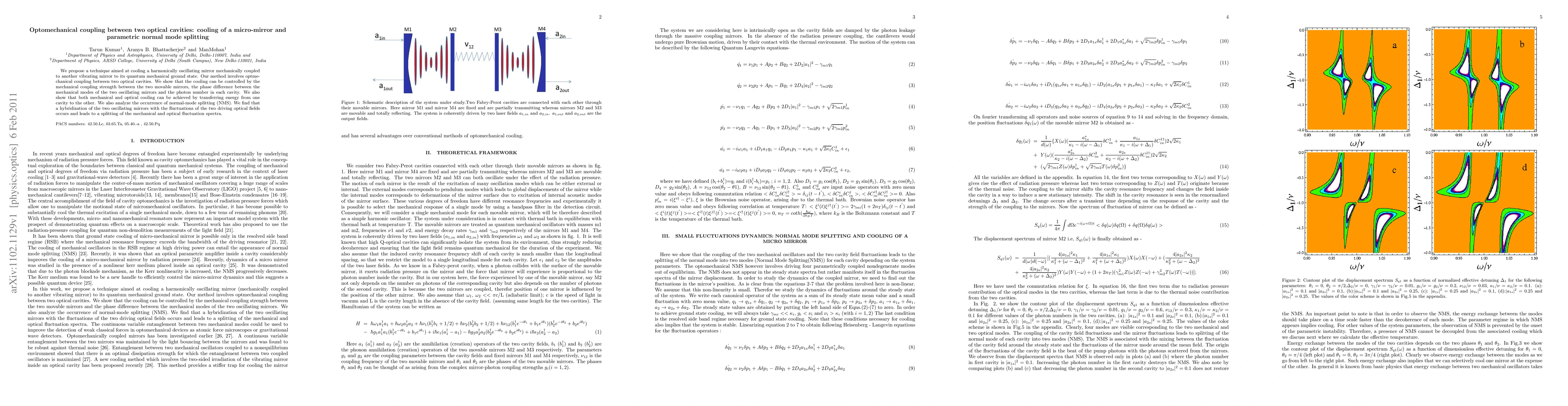 This research proposes a method to cool a micro-mirror to its quantum ground state via optomechanical coupling between two optical cavities, controllable by mechanical coupling strength, phase difference, and photon numbers. It also demonstrates normal-mode splitting due to hybridization of the mirrors' fluctuations with driving optical fields.