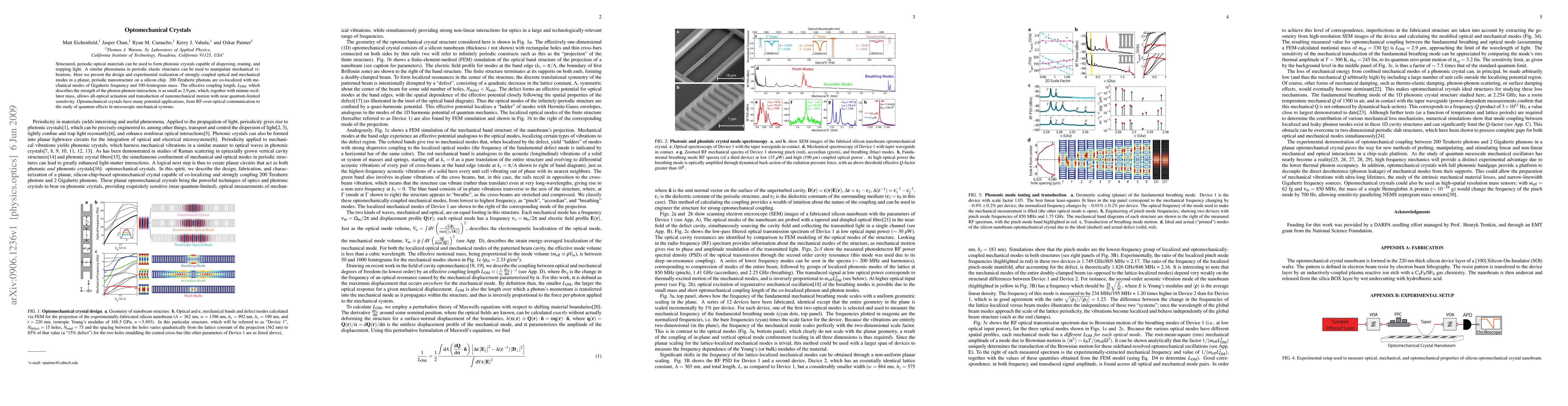 Structured, periodic optical materials can be used to form photonic crystals capable of dispersing, routing, and trapping light. A similar phenomena in periodic elastic structures can be used to manipulate mechanical vibrations. Here we present the design and experimental realization of strongly coupled optical and mechanical modes in a planar, periodic nanostructure on a silicon chip. 200-Terahertz photons are co-localized with mechanical modes of Gigahertz frequency and 100-femtogram mass. The effective coupling length, which describes the strength of the photon-phonon interaction, is as small as 2.9 microns, which, together with minute oscillator mass, allows all-optical actuation and transduction of nanomechanical motion with near quantum-limited sensitivity. Optomechanical crystals have many potential applications, from RF-over-optical communication to the study of quantum effects in mesoscopic mechanical systems.
