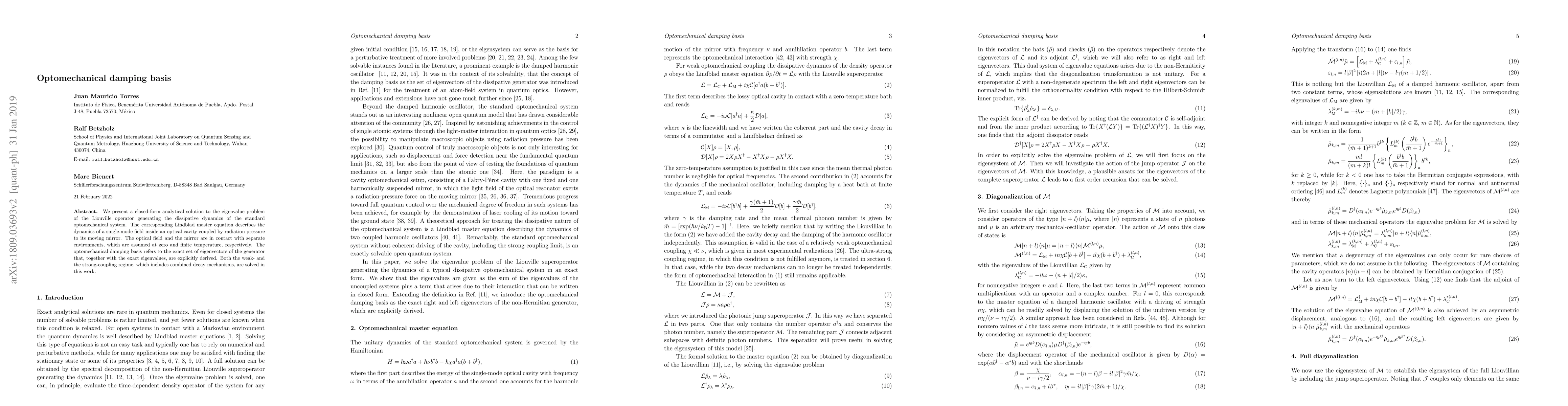 We present a closed-form analytical solution to the eigenvalue problem of the Liouville operator generating the dissipative dynamics of the standard optomechanical system. The corresponding Lindblad master equation describes the dynamics of a single-mode field inside an optical cavity coupled by radiation pressure to its moving mirror. The optical field and the mirror are in contact with separate environments, which are assumed at zero and finite temperature, respectively. The optomechanical damping basis refers to the exact set of eigenvectors of the generator that, together with the exact eigenvalues, are explicitly derived. Both the weak- and the strong-coupling regime, which includes combined decay mechanisms, are solved in this work.