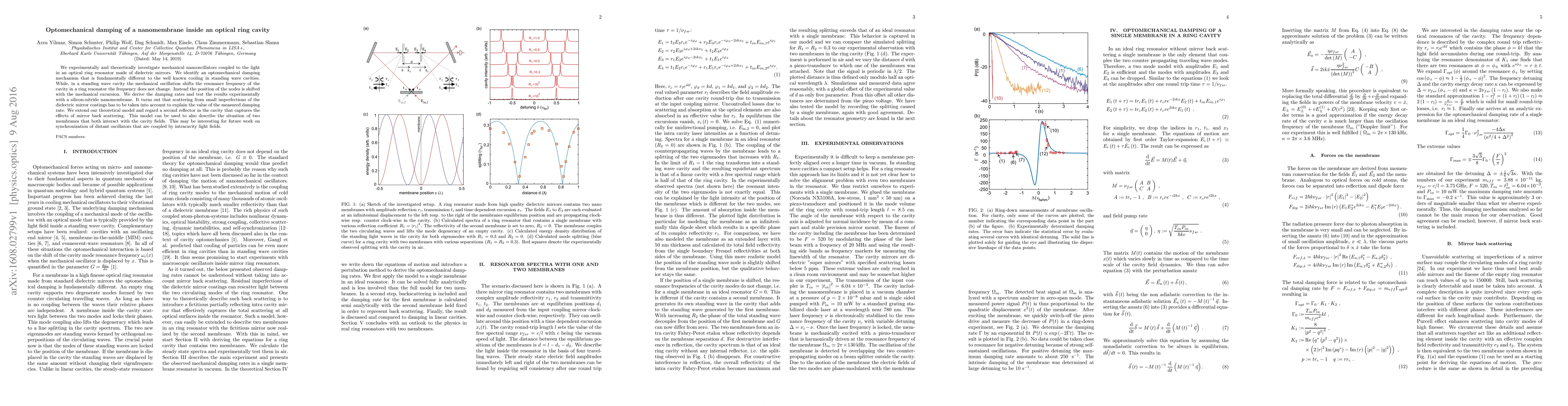 We experimentally and theoretically investigate mechanical nanooscillators coupled to the light in an optical ring resonator made of dielectric mirrors. We identify an optomechanical damping mechanism that is fundamentally different to the well known cooling in standing wave cavities. While, in a standing wave cavity the mechanical oscillation shifts the resonance frequency of the cavity in a ring resonator the frequency does not change. Instead the position of the nodes is shifted with the mechanical excursion. We derive the damping rates and test the results experimentally with a silicon-nitride nanomembrane. It turns out that scattering from small imperfections of the dielectric mirror coatings has to be taken into account to explain the value of the measured damping rate. We extend our theoretical model and regard a second reflector in the cavity that captures the effects of mirror back scattering. This model can be used to also describe the situation of two membranes that both interact with the cavity fields. This may be interesting for future work on synchronization of distant oscillators that are coupled by intracavity light fields.