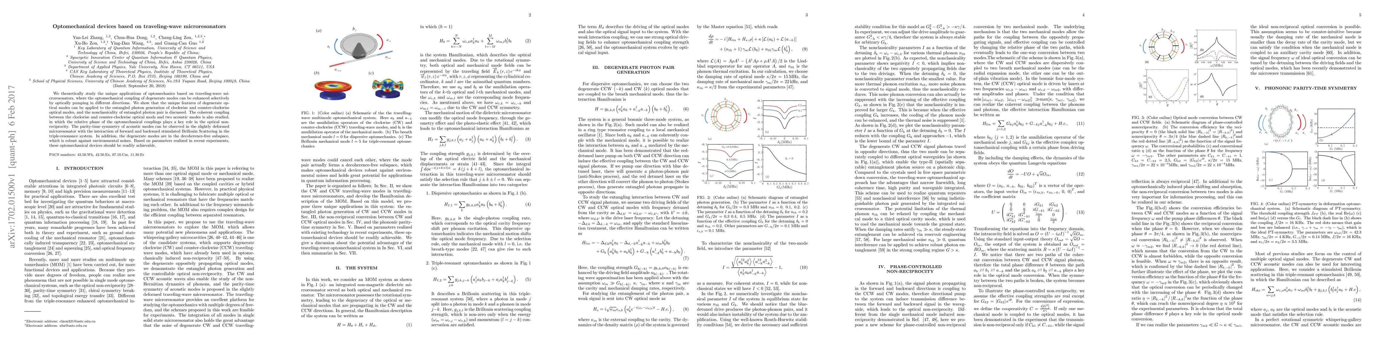 This paper explores optomechanical devices utilizing traveling-wave microresonators, demonstrating enhanced coupling of degenerate optical modes for generating entangled photon pairs and studying their nonclassicality. It also investigates the coherent coupling of optical and acoustic modes, highlighting the role of relative phase in optical non-reciprocity.