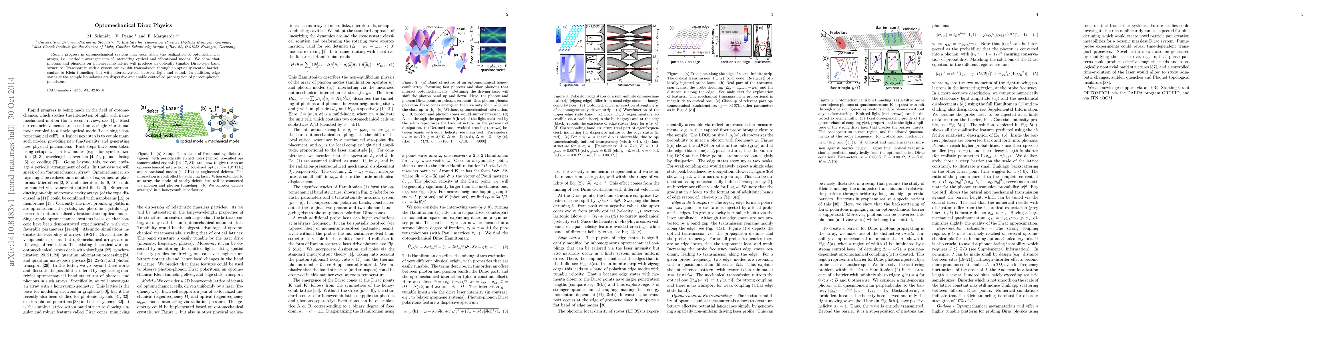 This paper demonstrates that optomechanical arrays on a honeycomb lattice can exhibit a Dirac-type band structure, allowing for Klein tunneling-like transmission through optical barriers with light-sound interconversion, and enabling controlled propagation of photon-phonon polaritons via dispersive edge states.