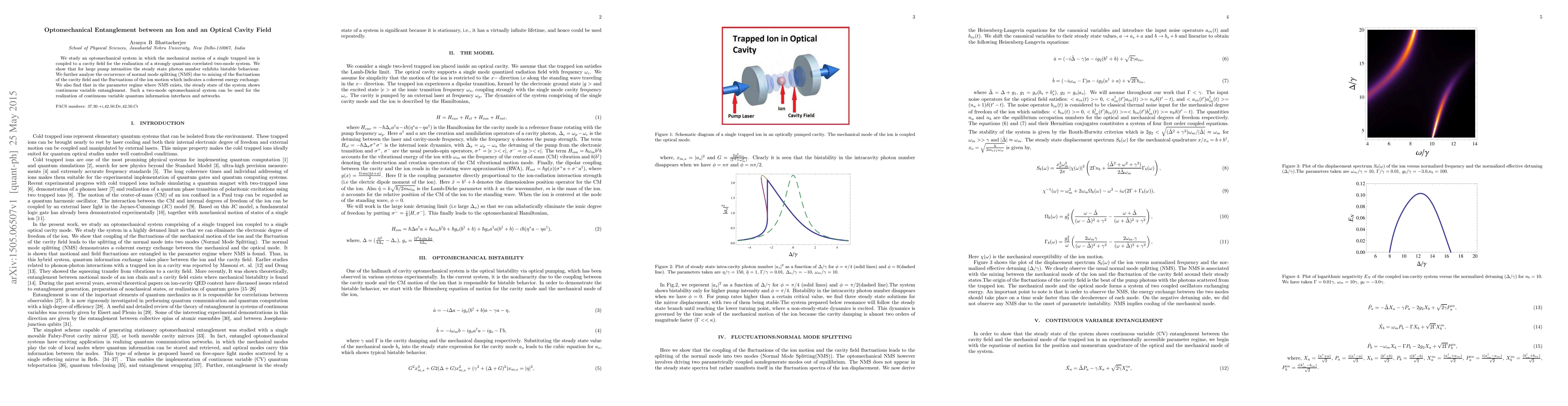 This paper investigates an optomechanical system where a trapped ion's mechanical motion is coupled to an optical cavity field, demonstrating bistable photon behavior and normal mode splitting. The study reveals continuous variable entanglement in the system, suggesting its potential for quantum information interfaces and networks.