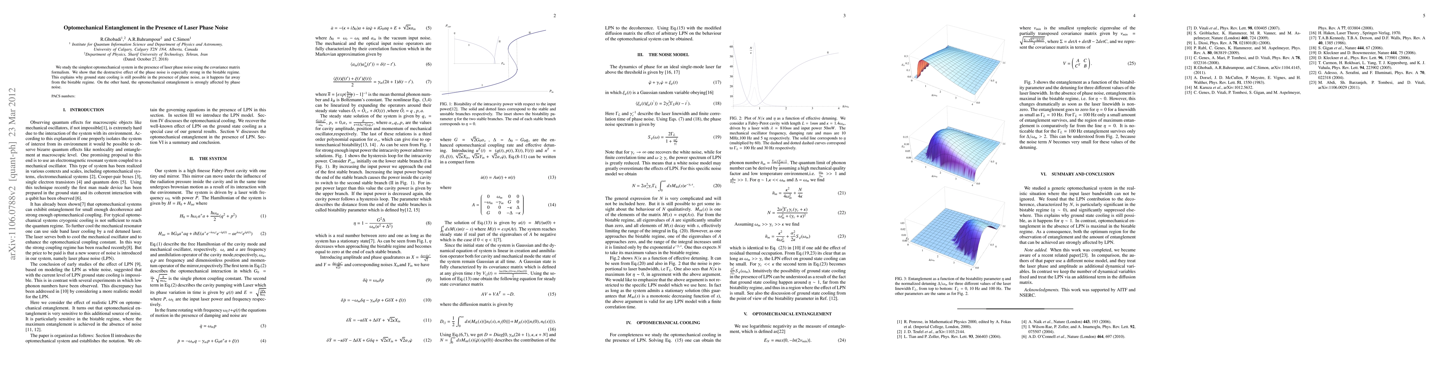 This paper investigates optomechanical entanglement in an optomechanical system with laser phase noise, revealing that while phase noise hinders entanglement, it does not impede ground state cooling when the system is far from the bistable regime.