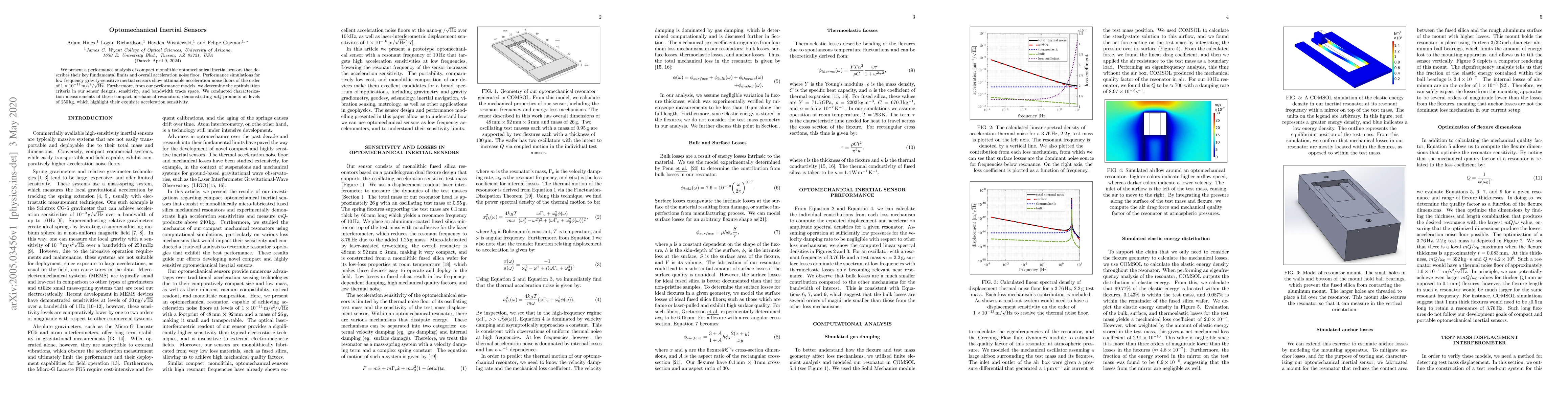 This paper analyzes the performance of compact optomechanical inertial sensors, achieving acceleration noise floors of 10^-11 ms^-2/rtHz. It identifies optimization criteria for design, sensitivity, and bandwidth, and demonstrates high mechanical quality factors of 250kg.