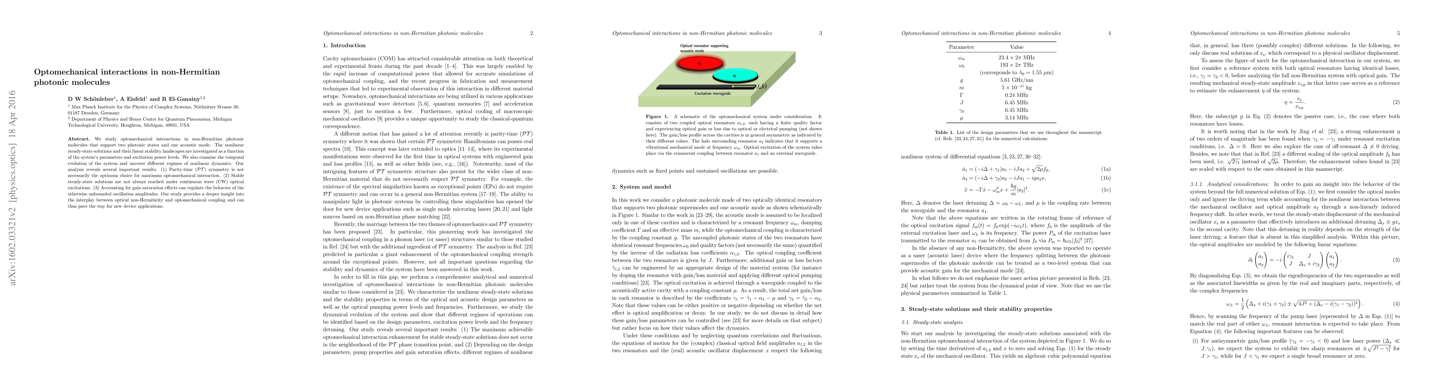 We study optomechanical interactions in non-Hermitian photonic molecules that support two photonic states and one acoustic mode. The nonlinear steady-state solutions and their linear stability landscapes are investigated as a function of the system's parameters and excitation power levels. We also examine the temporal evolution of the system and uncover different regimes of nonlinear dynamics. Our analysis reveals several important results: (1) Parity-time ($\mathcal{PT}$) symmetry is not necessarily the optimum choice for maximum optomechanical interaction. (2) Stable steady-state solutions are not always reached under continuous wave (CW) optical excitations. (3) Accounting for gain saturation effects can regulate the behavior of the otherwise unbounded oscillation amplitudes. Our study provides a deeper insight into the interplay between optical non-Hermiticity and optomechanical coupling and can thus pave the way for new device applications.