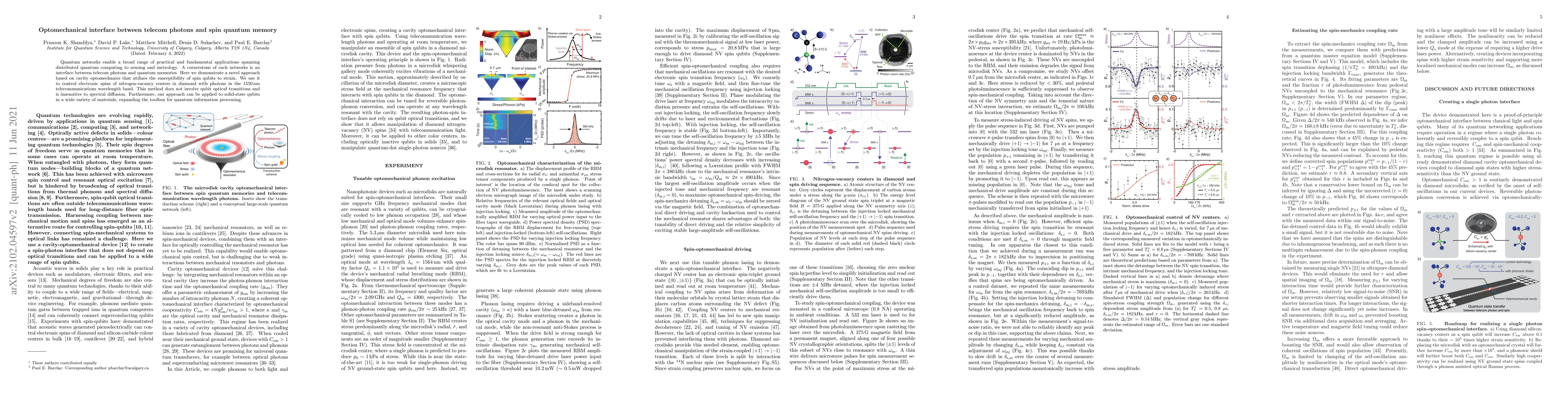 Quantum networks enable a broad range of practical and fundamental applications spanning distributed quantum computing to sensing and metrology. A cornerstone of such networks is an interface between telecom photons and quantum memories. Here we demonstrate a novel approach based on cavity optomechanics that utilizes the susceptibility of spin qubits to strain. We use it to control electron spins of nitrogen-vacancy centers in diamond with photons in the 1550 nm telecommunications wavelength band. This method does not involve qubit optical transitions and is insensitive to spectral diffusion. Furthermore, our approach can be applied to solid-state qubits in a wide variety of materials, expanding the toolbox for quantum information processing.