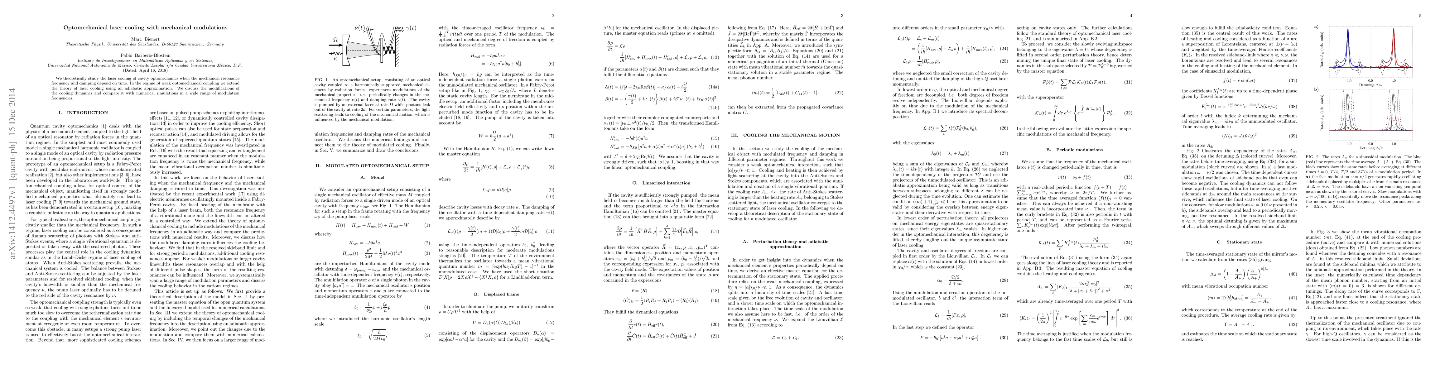This paper theoretically investigates laser cooling in optomechanical systems where mechanical resonance frequency and damping vary over time. It extends the adiabatic approximation for weak optomechanical coupling and compares the modified cooling dynamics with numerical simulations across various modulation frequencies.