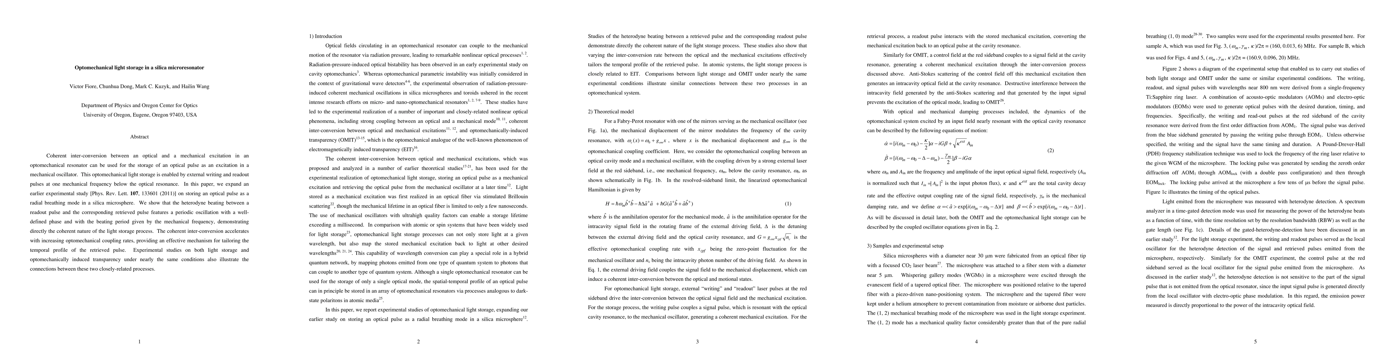 This paper demonstrates coherent optomechanical light storage in a silica microresonator, showing periodic oscillations in heterodyne beating between readout and retrieved pulses, confirming the process's coherent nature. The study highlights the acceleration of inter-conversion with higher optomechanical coupling rates, offering a method to tailor retrieved pulse profiles.