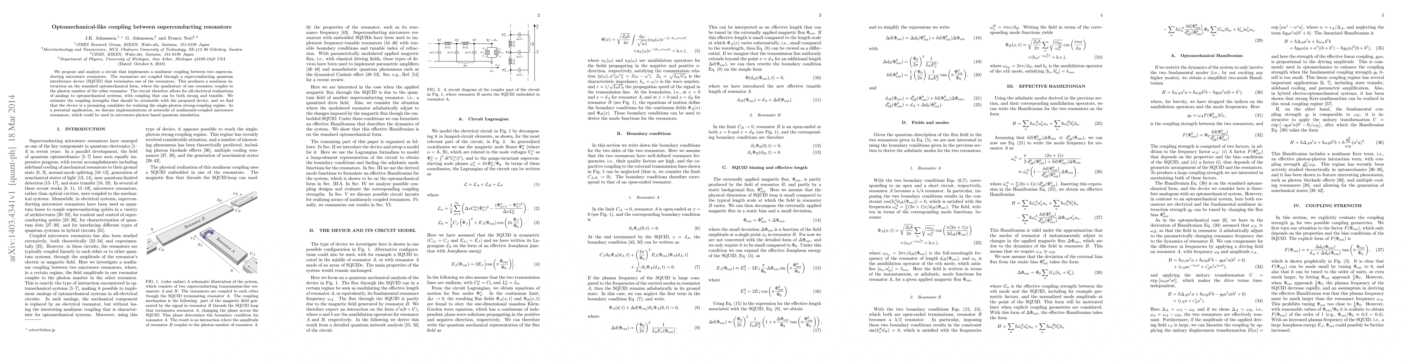 This paper proposes a circuit for nonlinear coupling between two superconducting microwave resonators via a SQUID, enabling analogs to optomechanical systems with strong and tunable coupling, potentially achieving single-photon strong-coupling regime, and suggesting applications in microwave-photon based quantum simulation.