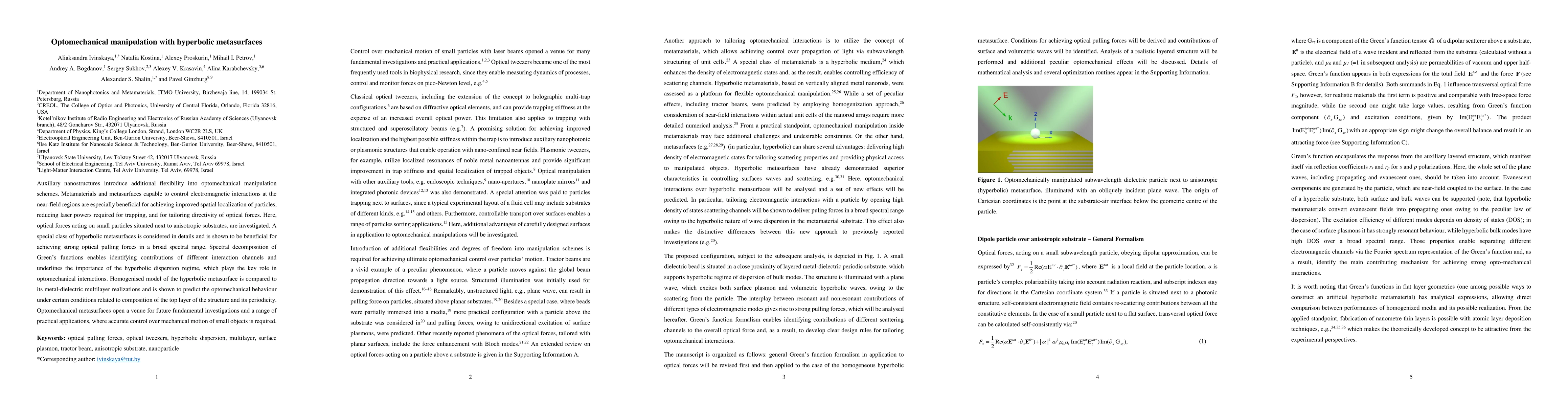 This research investigates the use of hyperbolic metasurfaces for enhanced optomechanical manipulation, demonstrating strong optical pulling forces and improved spatial localization of particles, which reduces required trapping laser powers. The study highlights the significance of the hyperbolic dispersion regime in achieving these effects and compares homogenised models to multilayer structures for practical applications in precise mechanical control.