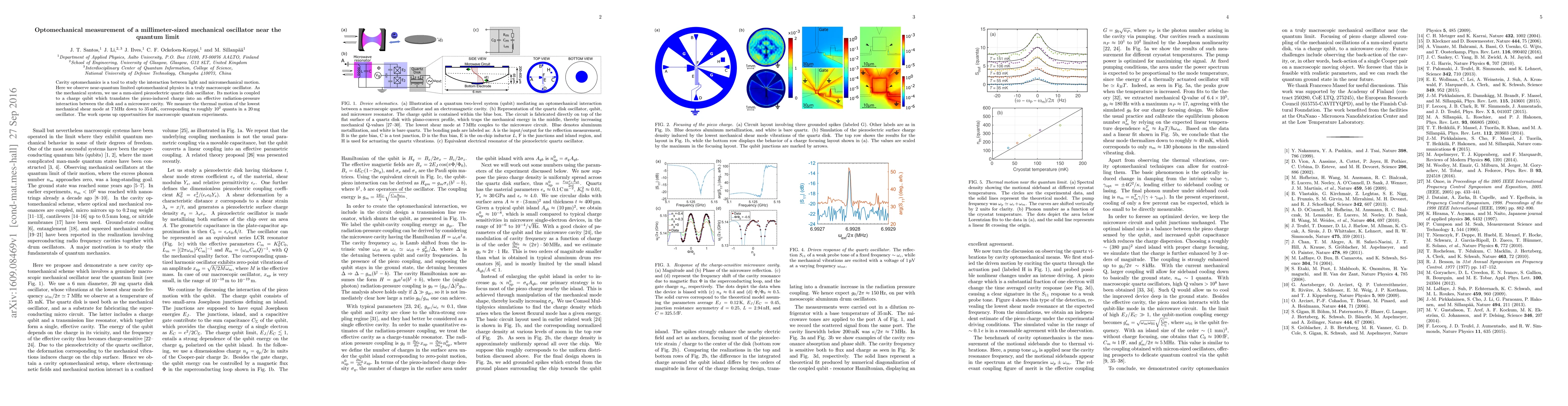 Cavity optomechanics is a tool to study the interaction between light and micromechanical motion. Here we observe near-quantum limited optomechanical physics in a truly macroscopic oscillator. As the mechanical system, we use a mm-sized piezoelectric quartz disk oscillator. Its motion is coupled to a charge qubit which translates the piezo-induced charge into an effective radiation-pressure interaction between the disk and a microwave cavity. We measure the thermal motion of the lowest mechanical shear mode at 7MHz down to 35 mK, corresponding to roughly 100 quanta in a 20mg oscillator. The work opens up opportunities for macroscopic quantum experiments.