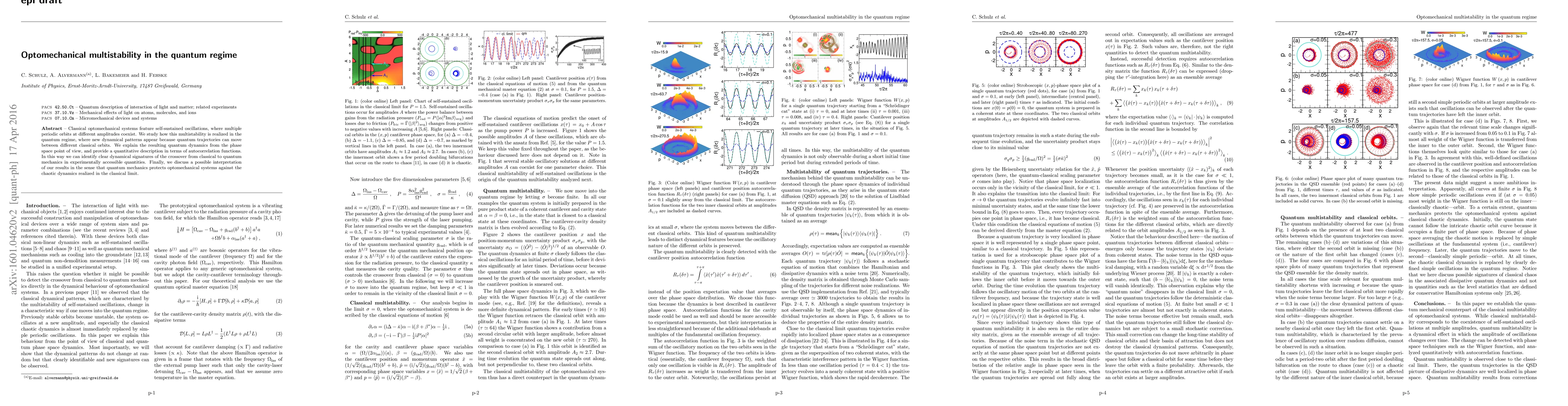 This paper investigates optomechanical multistability in the quantum regime, revealing new dynamical patterns due to quantum trajectories transitioning between classical orbits. It provides a phase space analysis and quantitative description via autocorrelation functions, identifying signatures of the classical-to-quantum crossover and suggesting quantum mechanics may protect against chaotic dynamics in classical optomechanics.