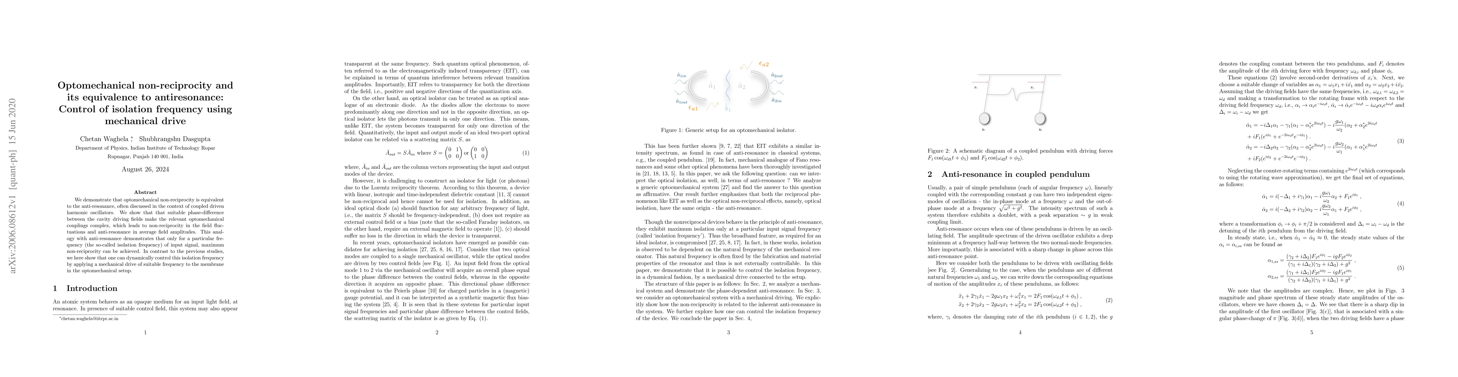 We demonstrate that optomechanical non-reciprocity is equivalent to the anti-resonance, often discussed in the context of coupled driven harmonic oscillators. We show that that suitable phase-difference between the cavity driving fields make the relevant optomechanical couplings complex, which leads to non-reciprocity in the field fluctuations and anti-resonance in average field amplitudes. This analogy with anti-resonance demonstrates that only for a particular frequency (the so-called isolation frequency) of input signal, maximum non-reciprocity can be achieved. In contrast to the previous studies, we here show that one can dynamically control this isolation frequency by applying a mechanical drive of suitable frequency to the membrane in the optomechanical setup.