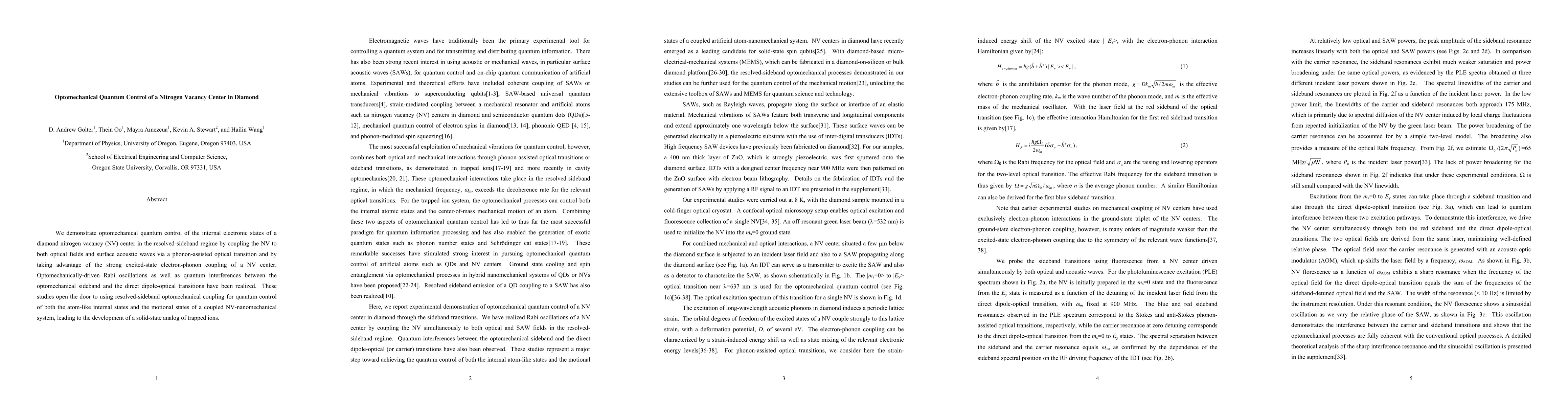 This paper demonstrates optomechanical quantum control of a nitrogen vacancy center in diamond, utilizing strong electron-phonon coupling to achieve resolved-sideband regime interactions. The study realizes optomechanically-driven Rabi oscillations and quantum interferences, paving the way for advanced solid-state quantum control systems.