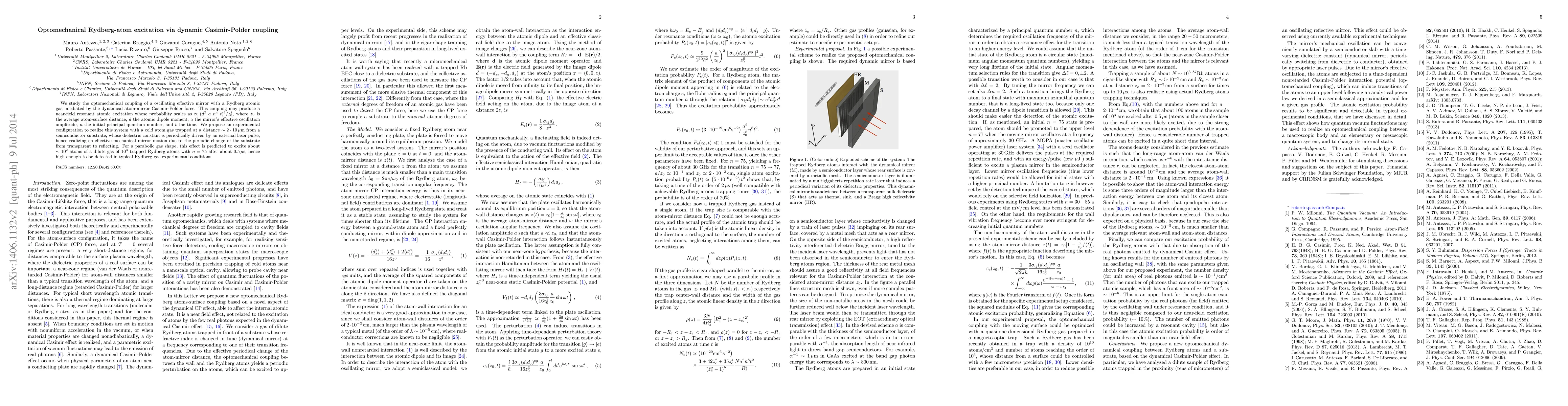 We study the optomechanical coupling of a oscillating effective mirror with a Rydberg atomic gas, mediated by the dynamical atom-mirror Casimir-Polder force. This coupling may produce a near-field resonant atomic excitation whose probability scales as $\propto (d^2\;a\;n^4\;t)^2/z_0^8$, where $z_0$ is the average atom-surface distance, $d$ the atomic dipole moment, $a$ the mirror's effective oscillation amplitude, $n$ the initial principal quantum number, and $t$ the time. We propose an experimental configuration to realize this system with a cold atom gas trapped at a distance $\sim 2\cdot10 \, \mu$m from a semiconductor substrate, whose dielectric constant is periodically driven by an external laser pulse, hence realizing en effective mechanical mirror motion due to the periodic change of the substrate from transparent to reflecting. For a parabolic gas shape, this effect is predicted to excite about $\sim 10^2$ atoms of a dilute gas of $10^3$ trapped Rydberg atoms with $n=75$ after about $0.5 \,\mu \mbox{s}$, hence high enough to be detected in typical Rydberg gas experimental conditions.