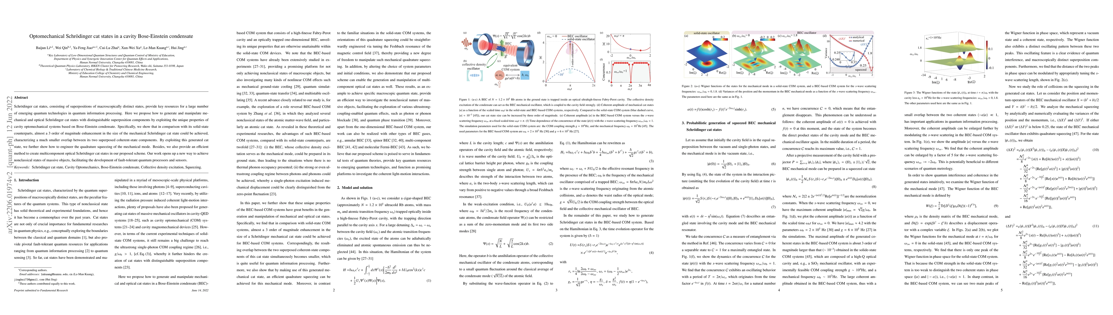 This paper proposes a method to generate and manipulate optomechanical Schrödinger cat states using a cavity Bose-Einstein condensate, achieving a significant enhancement in the size of mechanical cat states and enabling quadrature squeezing. The approach facilitates the creation of multicomponent optical cat states, advancing quantum technologies.