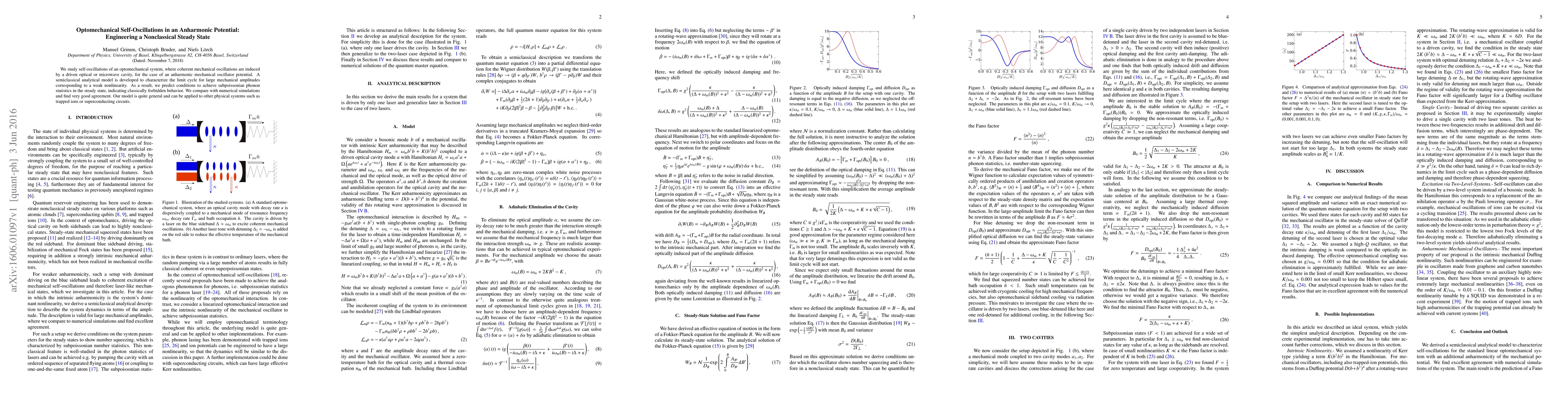 This paper develops a semiclassical analytical model to study self-oscillations in an optomechanical system with an anharmonic potential, predicting subpoissonian phonon statistics in the steady state. Numerical simulations confirm the model's predictions, indicating classically forbidden behavior and potential applications to other physical systems.