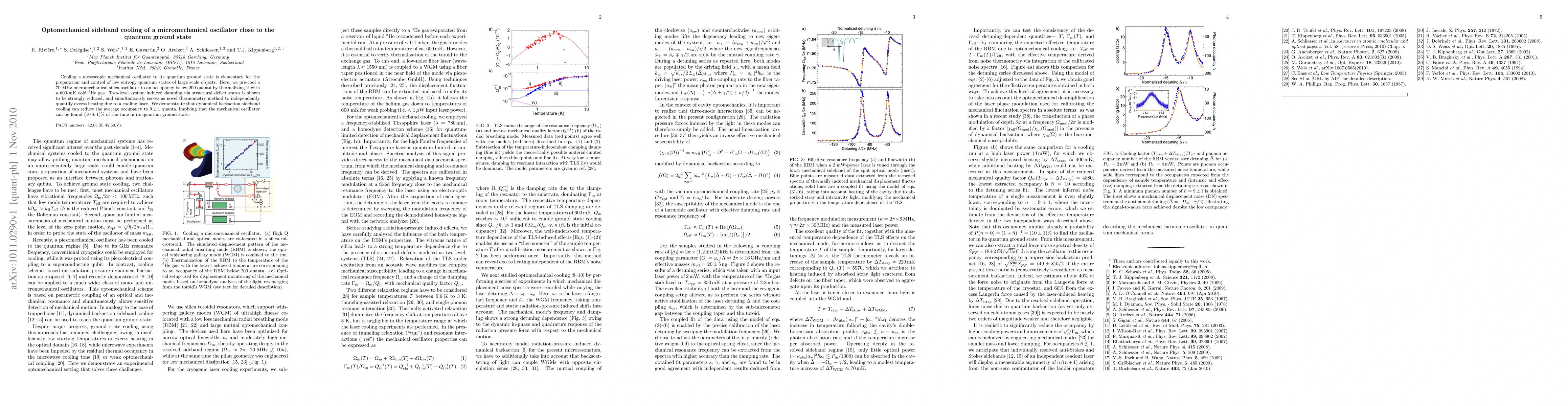 This paper reports the cooling of a 70-MHz micromechanical oscillator to a low occupancy of 9±1 quanta using optomechanical sideband cooling, achieving near quantum ground state conditions and demonstrating reduced damping from structural defects. The study also introduces a novel thermometry method using two-level systems to measure heating effects from the cooling laser.