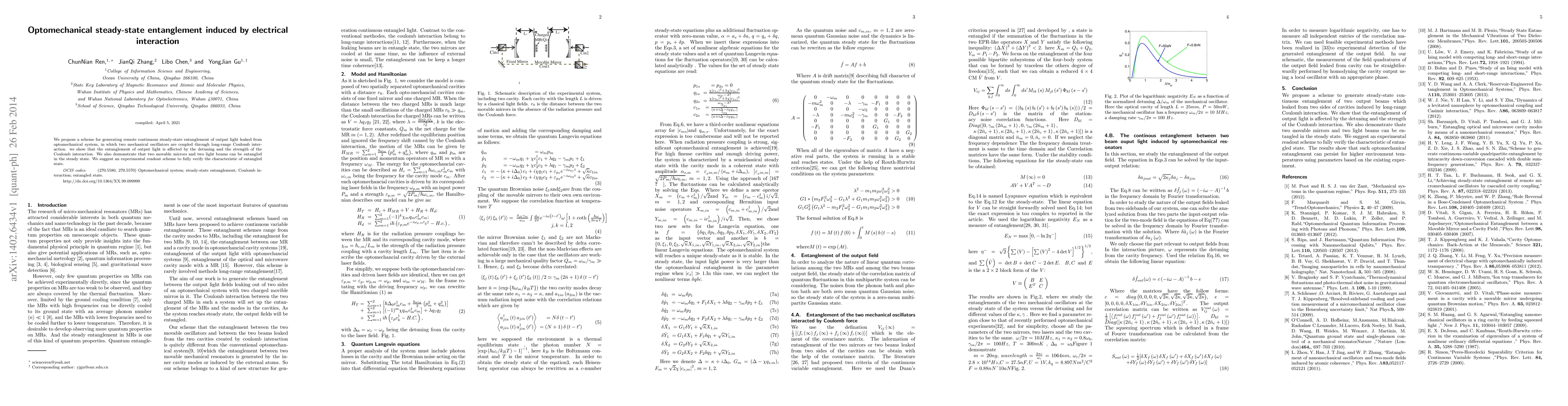 We propose a scheme for generating remote continuous steady-state entanglement of output light leaked from optomechanical system, in which two mechanical oscillators are coupled through long-range Coulomb interaction. we show that the entanglement of output light is affected by the detuning and the strength of the Coulomb interaction. We also demonstrate that two movable mirrors and two light beams can be entangled in the steady state. We suggest an experimental readout scheme to fully verify the characteristic of entangled state.