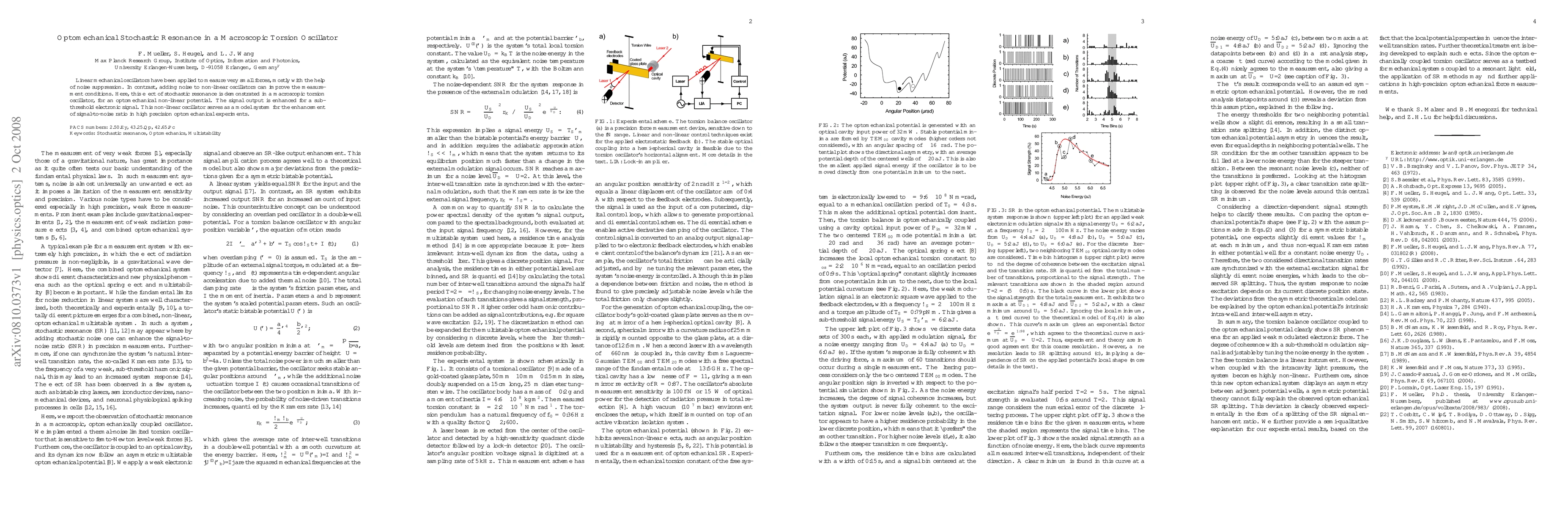This paper demonstrates optomechanical stochastic resonance in a macroscopic torsion oscillator, showing that adding noise to a non-linear oscillator can enhance signal output for sub-threshold electronic signals, thus improving the signal-to-noise ratio in high-precision optomechanical experiments.