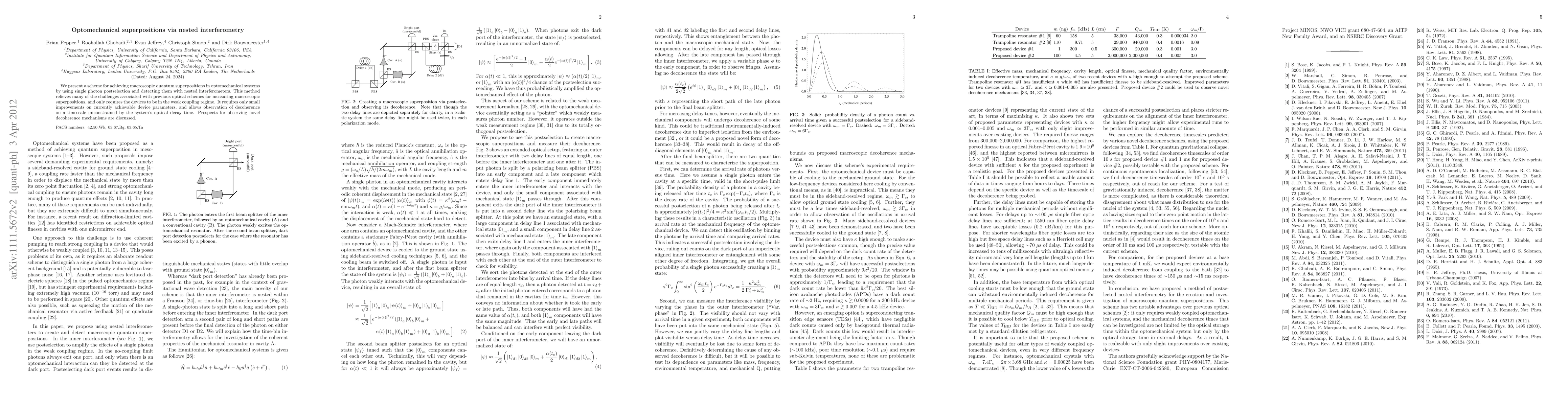 We present a scheme for achieving macroscopic quantum superpositions in optomechanical systems by using single photon postselection and detecting them with nested interferometers. This method relieves many of the challenges associated with previous optical schemes for measuring macroscopic superpositions, and only requires the devices to be in the weak coupling regime. It requires only small improvements on currently achievable device parameters, and allows observation of decoherence on a timescale unconstrained by the system's optical decay time. Prospects for observing novel decoherence mechanisms are discussed.