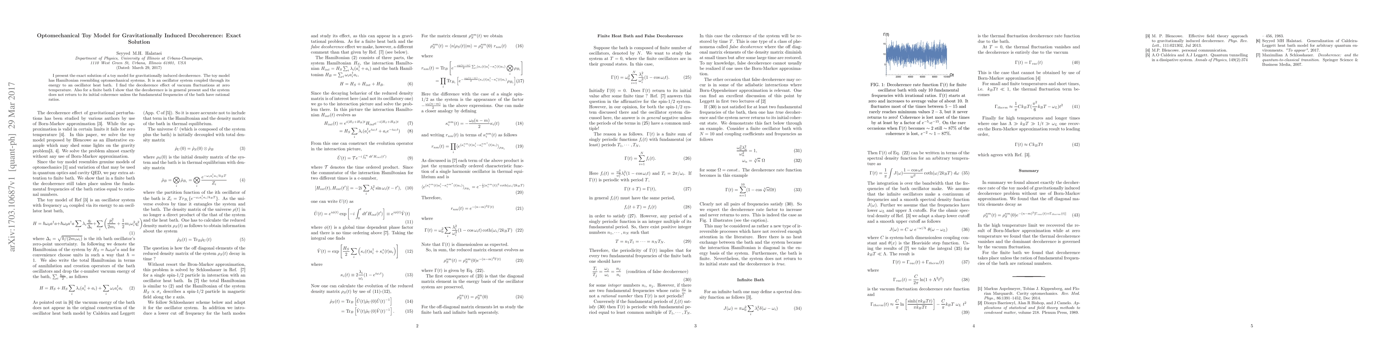This paper presents the exact solution of a simplified optomechanical toy model for gravitationally induced decoherence, demonstrating that vacuum fluctuations cause decoherence at zero temperature, and that finite bath interactions generally maintain decoherence unless the bath frequencies have rational ratios.