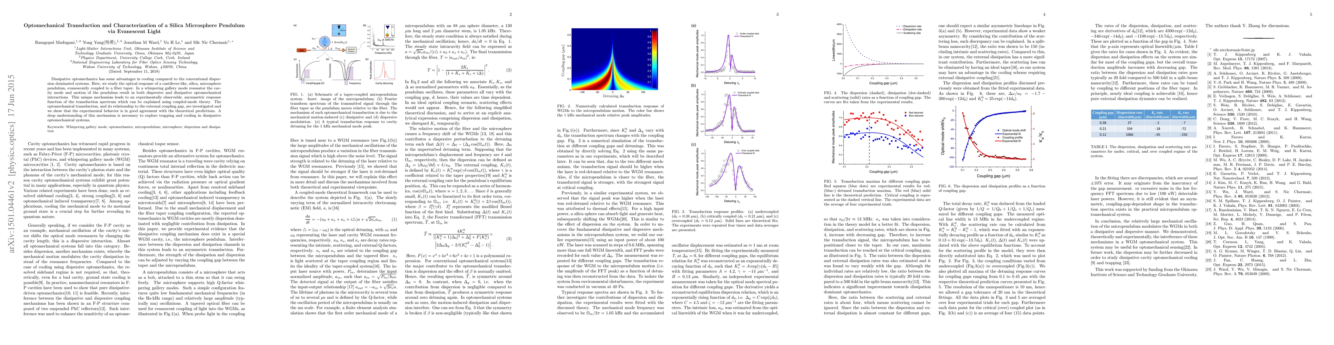 This paper investigates the optomechanical transduction in a silica microsphere pendulum evanescently coupled to a fiber taper, demonstrating asymmetric response functions due to both dispersive and dissipative interactions. Theoretical predictions align well with experimental observations, highlighting the potential for trapping and cooling in such systems.