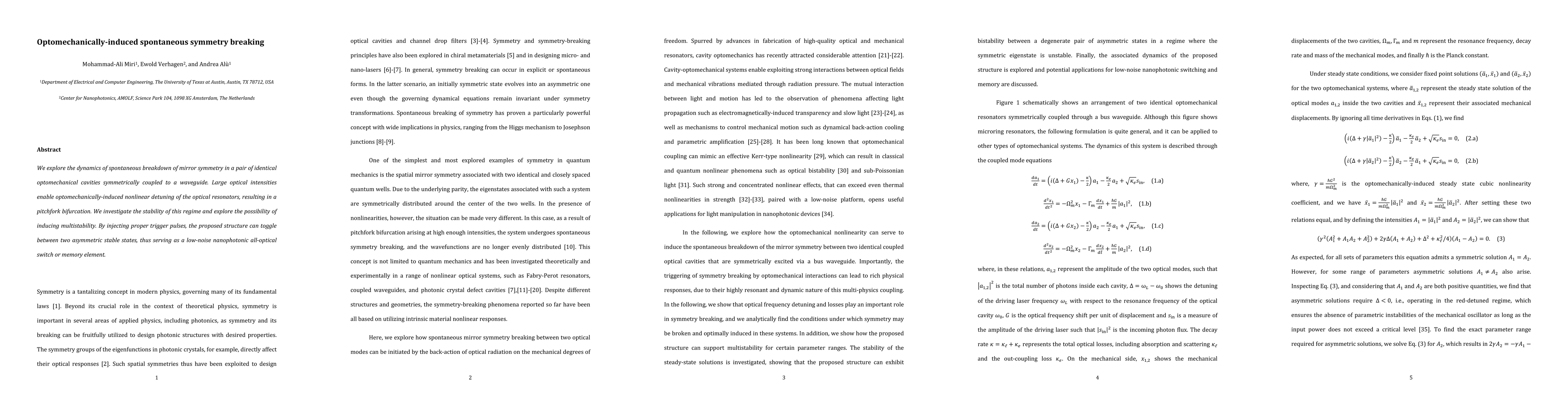 We explore the dynamics of spontaneous breakdown of mirror symmetry in a pair of identical optomechanical cavities symmetrically coupled to a waveguide. Large optical intensities enable optomechanically-induced nonlinear detuning of the optical resonators, resulting in a pitchfork bifurcation. We investigate the stability of this regime and explore the possibility of inducing multistability. By injecting proper trigger pulses, the proposed structure can toggle between two asymmetric stable states, thus serving as a low-noise nanophotonic all-optical switch or memory element.