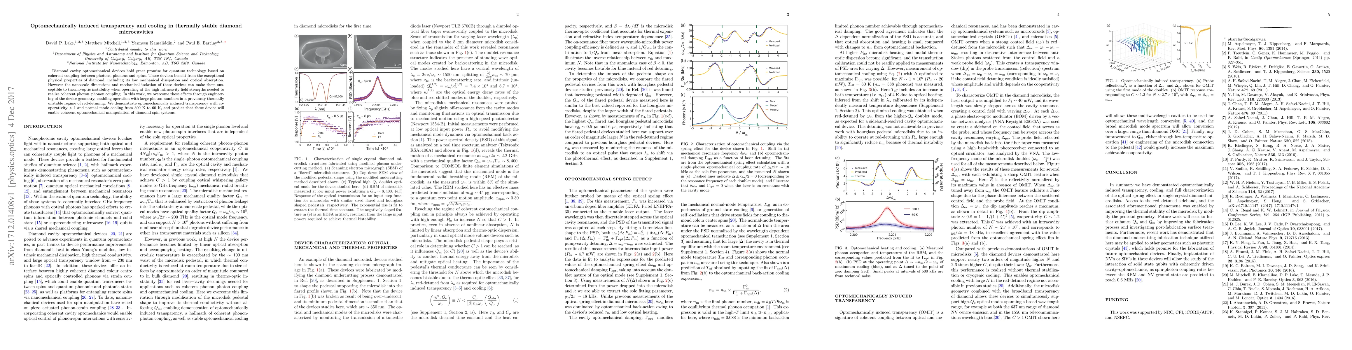 Diamond cavity optomechanical devices hold great promise for quantum technology based on coherent coupling between photons, phonons and spins. These devices benefit from the exceptional physical properties of diamond, including its low mechanical dissipation and optical absorption. However the nanoscale dimensions and mechanical isolation of these devices can make them susceptible to thermo-optic instability when operating at the high intracavity field strengths needed to realize coherent photon--phonon coupling. In this work, we overcome these effects through engineering of the device geometry, enabling operation with large photon numbers in a previously thermally unstable regime of red-detuning. We demonstrate optomechanically induced transparency with cooperativity > 1 and normal mode cooling from 300 K to 60 K, and predict that these device will enable coherent optomechanical manipulation of diamond spin systems.