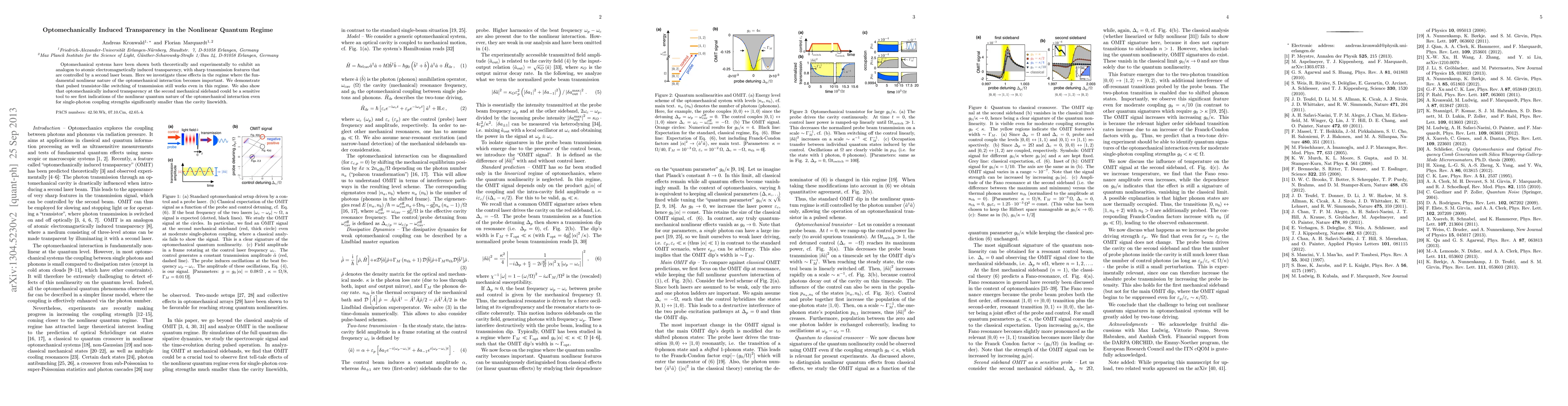 This paper investigates optomechanically induced transparency in the nonlinear quantum regime, demonstrating transistor-like switching of transmission and revealing that optomechanically induced transparency at the second mechanical sideband can indicate the nonlinear quantum nature of the interaction at single-photon coupling strengths below the cavity linewidth.