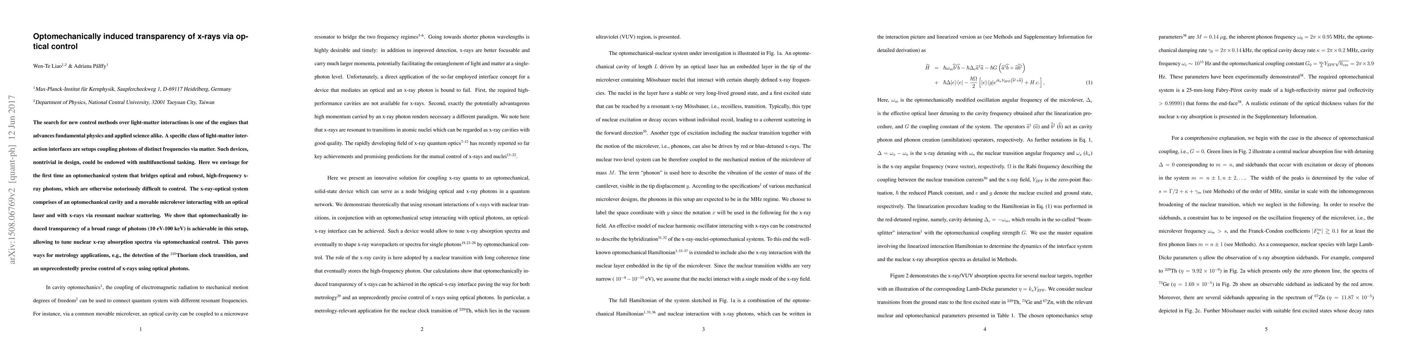 The search for new control methods over light-matter interactions is one of the engines that advances fundamental physics and applied science alike. A specific class of light-matter interaction interfaces are setups coupling photons of distinct frequencies via matter. Such devices, nontrivial in design, could be endowed with multifunctional tasking. Here we envisage for the first time an optomechanical system that bridges optical and robust, high-frequency x-ray photons, which are otherwise notoriously difficult to control. The x-ray-optical system comprises of an optomechanical cavity and a movable microlever interacting with an optical laser and with x-rays via resonant nuclear scattering. We show that optomechanically induced transparency of a broad range of photons (10 eV-100 keV) is achievable in this setup, allowing to tune nuclear x-ray absorption spectra via optomechanical control. This paves ways for metrology applications, e.g., the detection of the $^{229}$Thorium clock transition, and an unprecedentedly precise control of x-rays using optical photons.