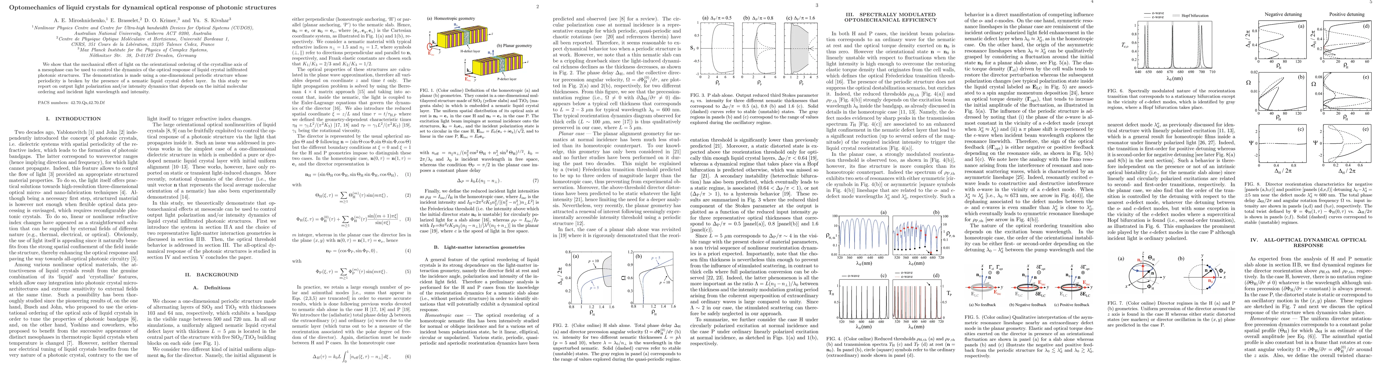 This paper demonstrates the use of light-induced mechanical effects on liquid crystals to dynamically control the optical response of photonic structures. The study shows that the initial molecular ordering and light parameters influence the output light polarization and intensity in a one-dimensional photonic structure with a nematic liquid crystal defect layer.