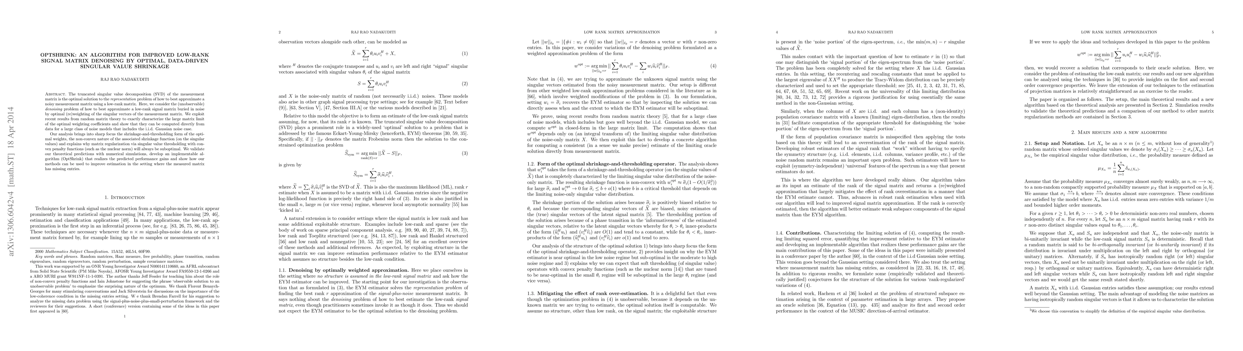 OptShrink is an algorithm that optimally shrinks singular values to denoise low-rank signal matrices, leveraging data-driven weighting coefficients derived from random matrix theory. It demonstrates superior performance over convex regularization methods and is validated through numerical simulations.