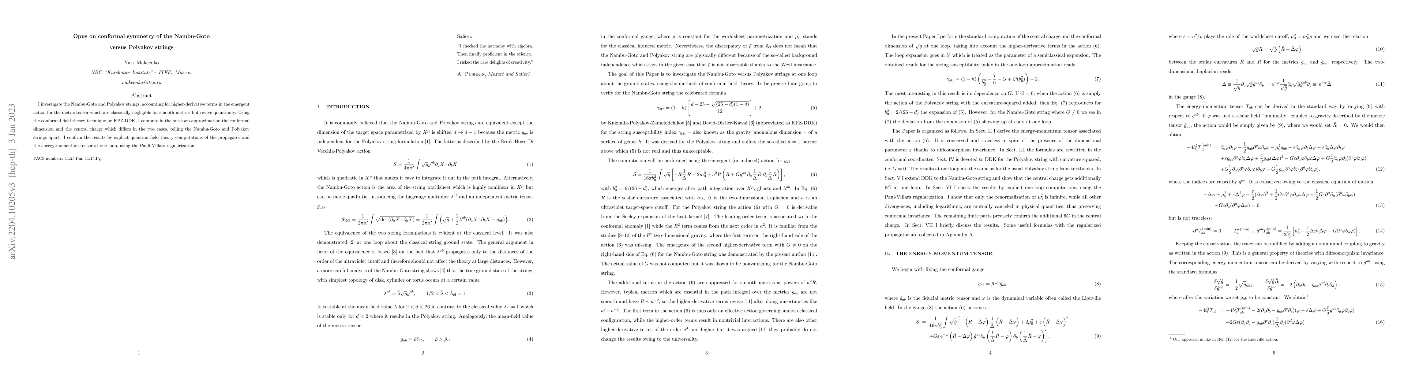 I investigate the Nambu-Goto and Polyakov strings, accounting for higher-derivative terms in the emergent action for the metric tensor which are classically negligible for smooth metrics but revive quantumly. Using the conformal field theory technique by KPZ-DDK, I compute in the one-loop approximation the conformal dimension and the central charge which differs in the two cases, telling the Nambu-Goto and Polyakov strings apart. I confirm the results by explicit quantum field theory computations of the propagator and the energy-momentum tensor at one loop, using the Pauli-Villars regularization.